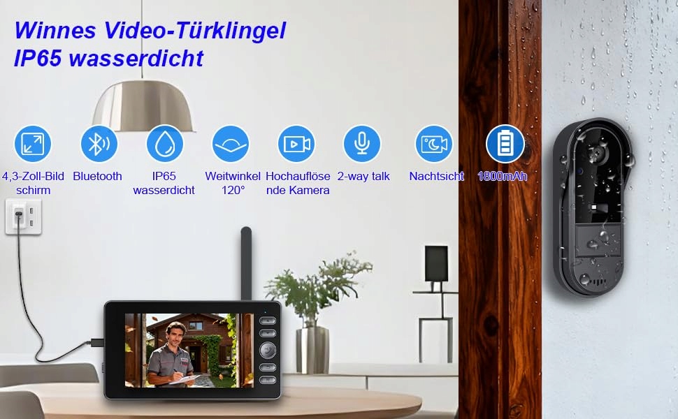 Winnes wideodomofon, wodoodporny IP65, wideodomofon z ekranem IPS 4,3'' 1080P, bezprzewodowy wideodomofon na zewnątrz, cyfrowy wizjer 1800mAh z ultra szerokim kątem