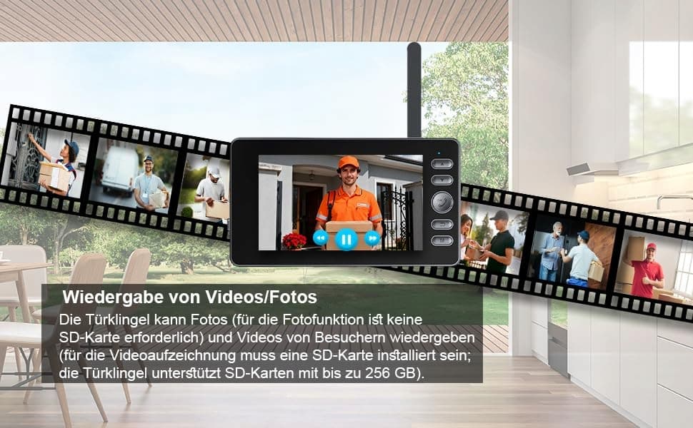 【Wielofunkcyjny dzwonek do drzwi】 Wideodomofon z dwukierunkową komunikacją, można go zainstalować na zewnątrz. Użytkowanie na zewnątrz: 1. Nagrywanie wideo: Po włożeniu karty SD wideodomofon automatycznie nagrywa wideo, gdy ktoś naciśnie dzwonek. 2. Robienie zdjęć: Nie jest wymagane wkładanie karty SD. Gdy ktoś naciśnie dzwonek, elektroniczna kamera wizjera robi zdjęcie i zapisuje je. Użytkowanie wewnątrz: Ekran musi być zainstalowany przy wejściu lub w salonie i zasilany z gniazdka.