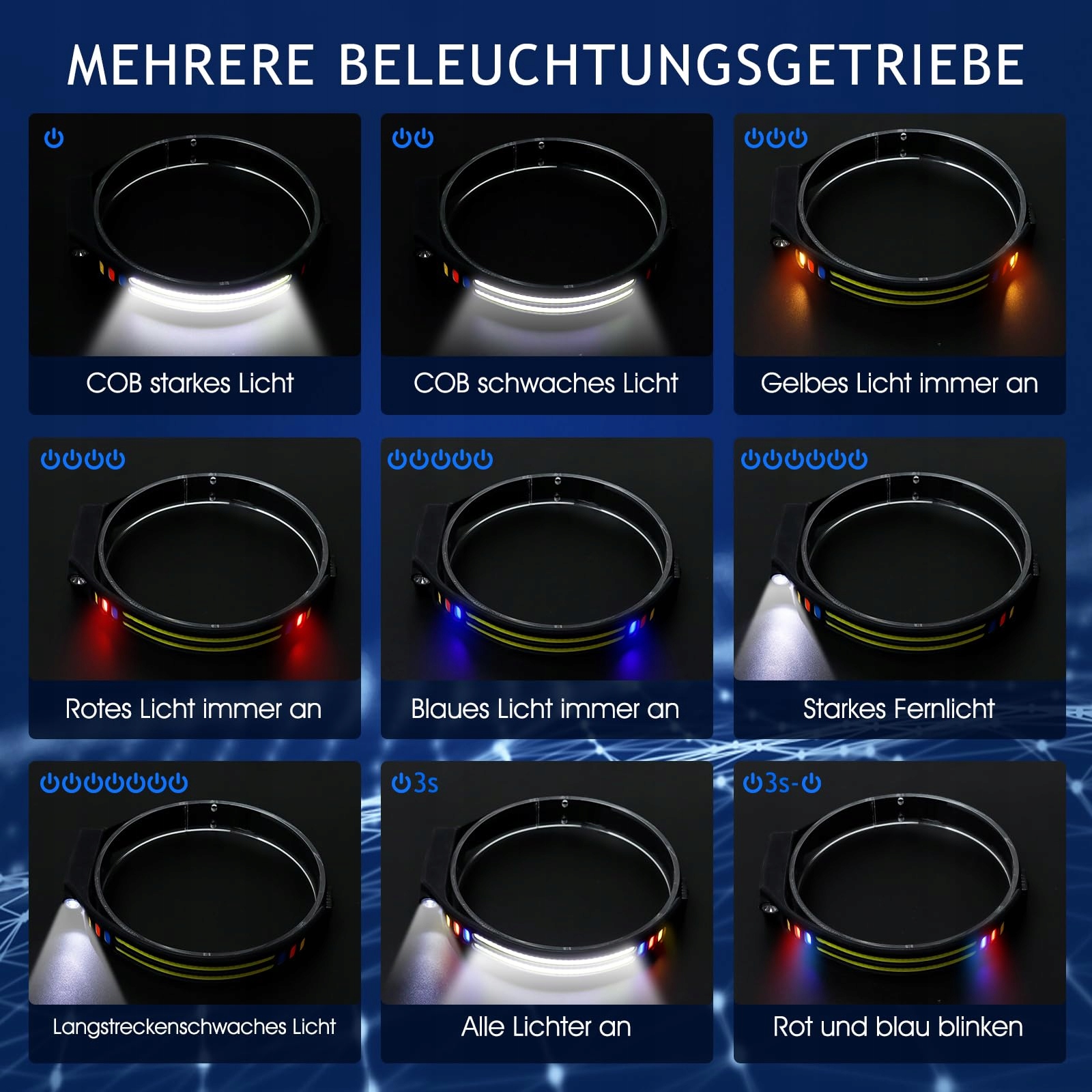 [9 trybów oświetlenia & 4 kolory]Ta latarka czołowa LED ładowalna ma 9 trybów świetlnych i 4 kolory: biały, żółty, czerwony, niebieski. COB mocne światło, COB słabe światło, żółte światło świeci zawsze, czerwone światło świeci zawsze, niebieskie światło świeci zawsze, dalekosiężne mocne światło, dalekosiężne słabe światło, wszystkie światła świecą po długim naciśnięciu przełącznika, kliknij po długim naciśnięciu przełącznika, czerwony i niebieski błysk. Wszystkie Twoje potrzeby mogą być spełnione.