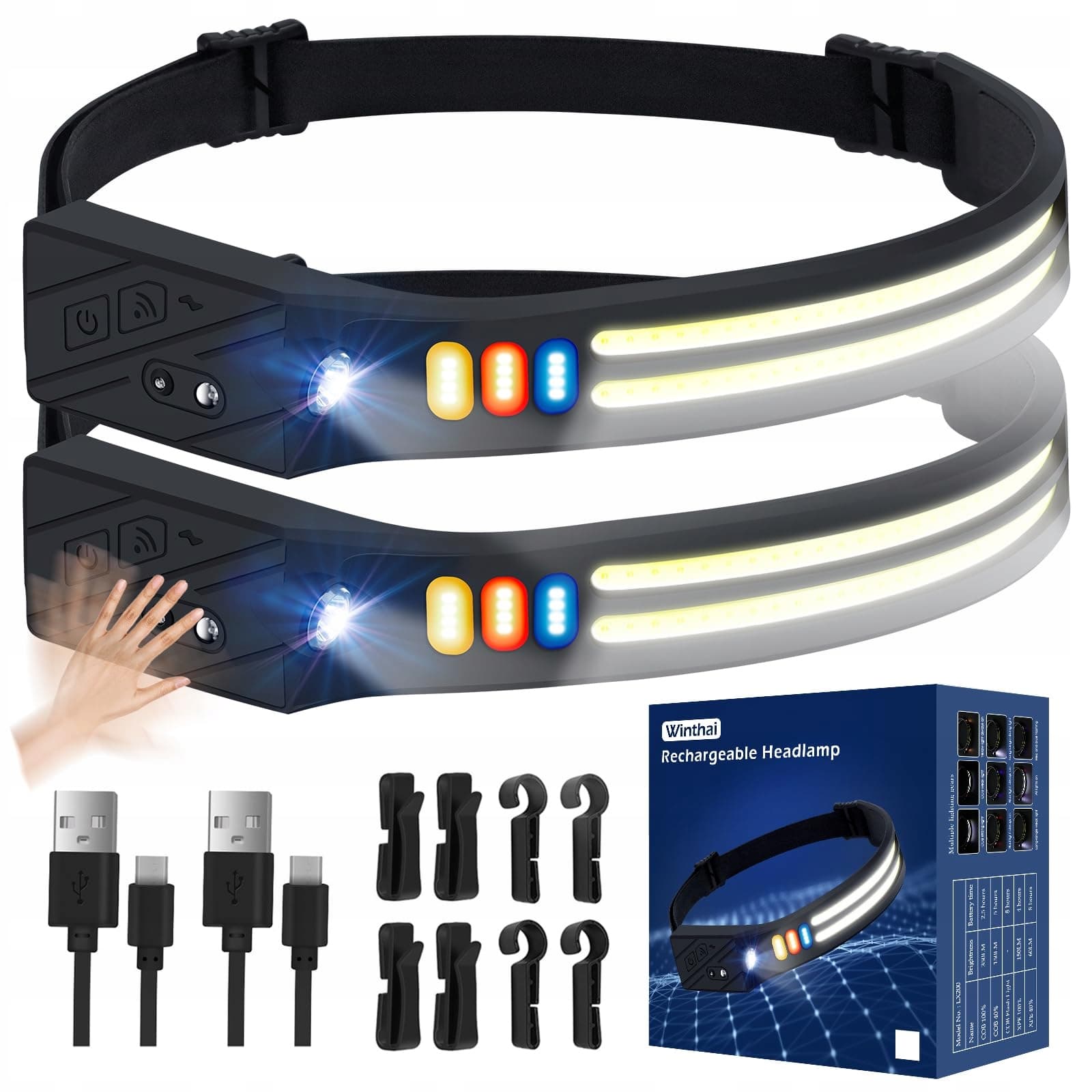 Latarka czołowa Winthai LED Ładowalna - 2CM Ultra cienka 1500Mah Inteligentny czujnik Super Jasna LED Latarka czołowa z 9 trybami świetlnymi 4 kolory 90g Lekka IPX4 Wodoodporna do biegania, joggingu, wędkowania.