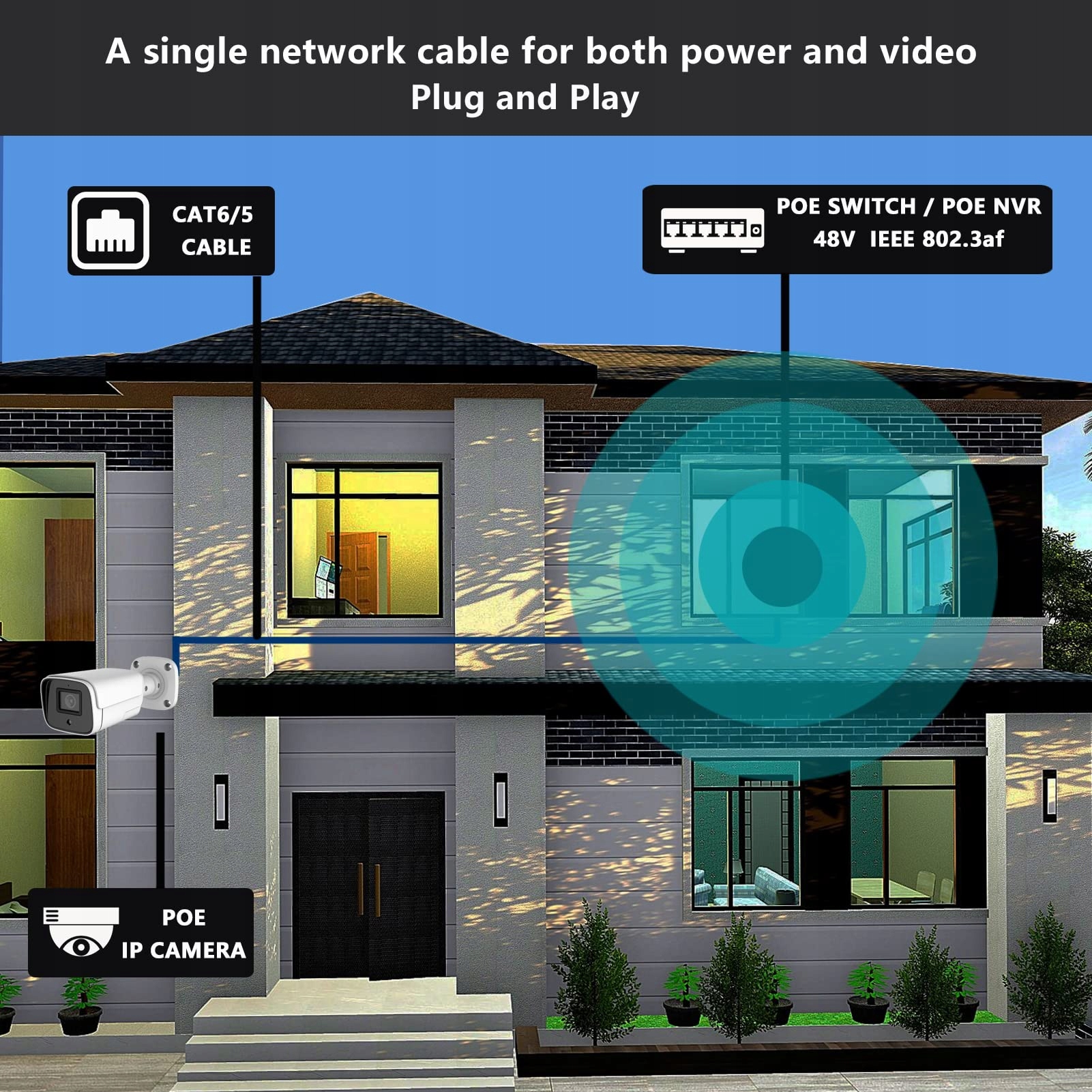 POE i audio: Ta doskonała kamera do monitoringu posiada wbudowany mikrofon z redukcją szumów dla wyraźnego nadzoru audio i nagrywania. Power over Ethernet (PoE) umożliwia instalację kamery bez potrzeby zasilania prądem stałym. Do korzystania z funkcji POE wymagany jest jednak przełącznik POE lub NVR POE.