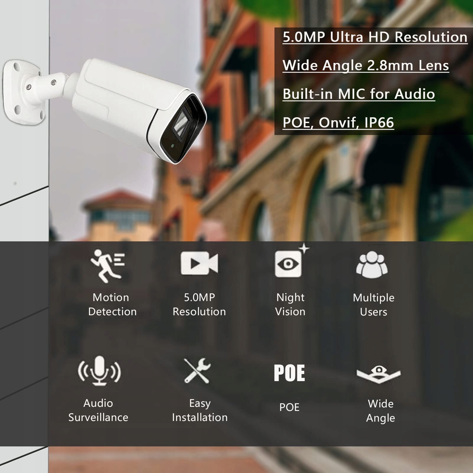 WiTi 5MP Kamera IP POE, Wbudowany mikrofon Kamera do monitoringu audio, Obiektyw 2,8 mm szerokokątny, Wykrywanie ciała ludzkiego, Odporna na warunki atmosferyczne IP66