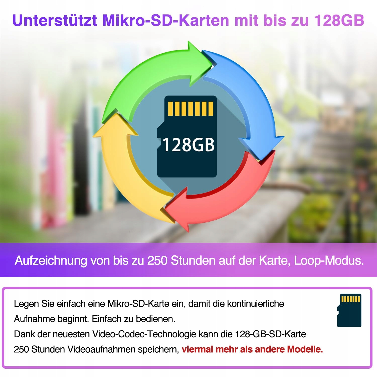 𝗗𝗮𝗻𝗸 𝗛.𝟮𝟲𝟱 𝗺𝗲𝗵𝗿 𝗔𝘂𝗳𝗻𝗮𝗵𝗺𝗲𝗻 𝘀𝗽𝗲𝗶𝗰𝗵𝗲𝗿𝗻, 𝟮𝟱𝟬 𝗦𝘁𝘂𝗻𝗱𝗲𝗻 𝗨𝗛𝗗-𝗩𝗶𝗱𝗲𝗼𝘀: Kamera wykorzystuje najnowszą technologię wideo H.265 do przechowywania materiału wideo na karcie SD. Z kartą 128 GB możesz przechować ponad 250 godzin filmów Ultra HD, co jest czterokrotnie więcej niż w innych modelach. Dzięki tej funkcji kamera wyróżnia się na tle innych podobnych modeli i jest niezwykle korzystna dla użytkowników.
