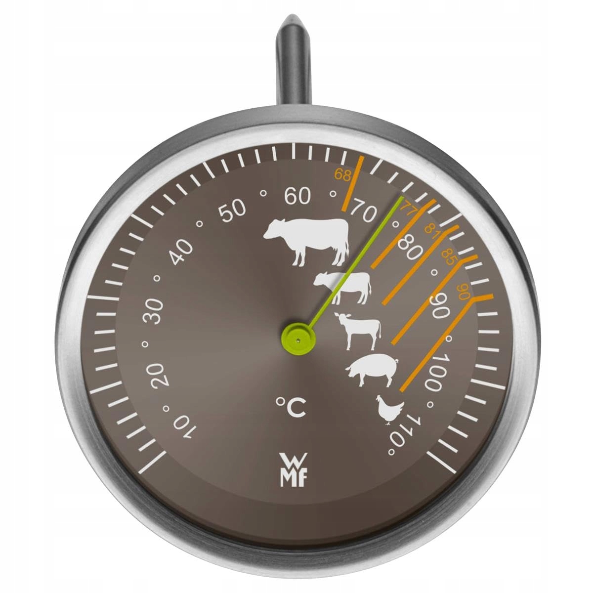 WMF termometr do mięsa analogowy 6,3 cm, termometr do pieczenia z oznaczeniami punktów gotowania dla steków wołowych cielęcych jagnięcych wieprzowych drobiowych, sonda do 110°C