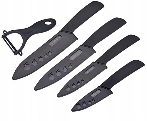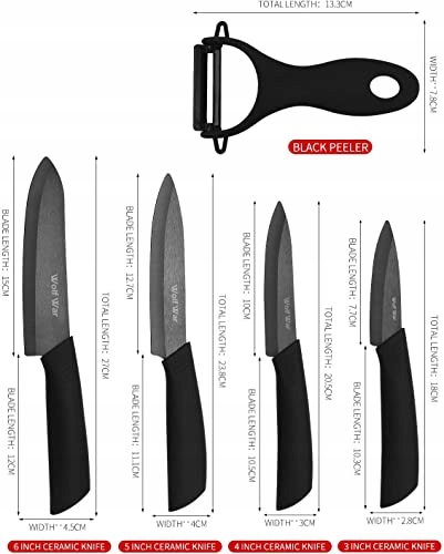 Noże ceramiczne Wolf War, zestaw noży ceramicznych z osłoną, zestaw noży kuchennych z 4 nożami i 1 obieraczką, zestawy noży kuchennych do mięsa, owoców, warzyw - czarny