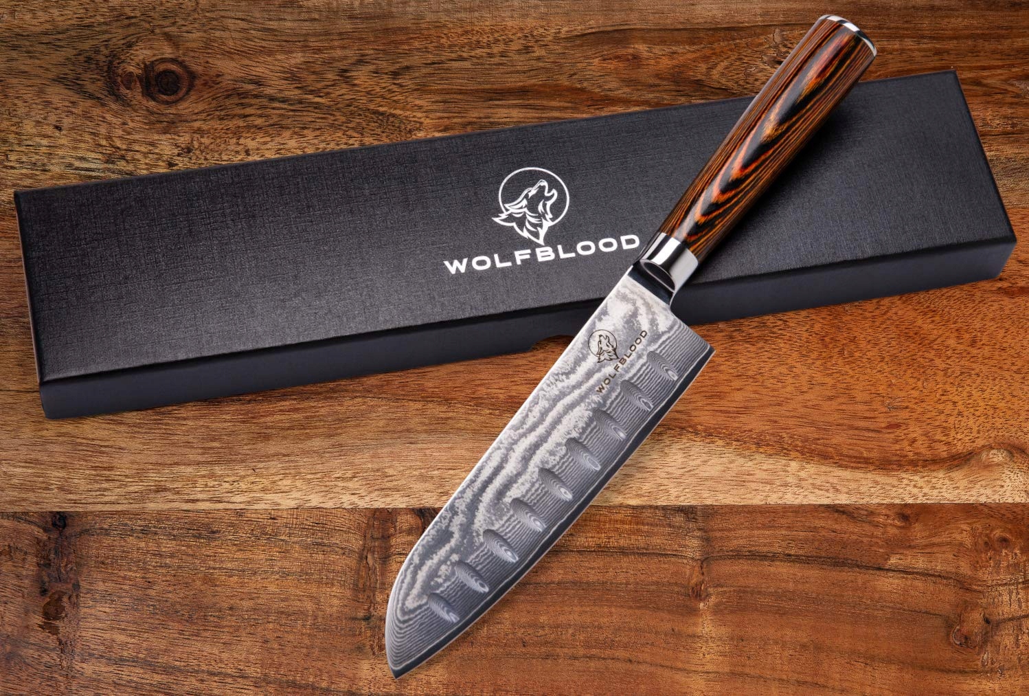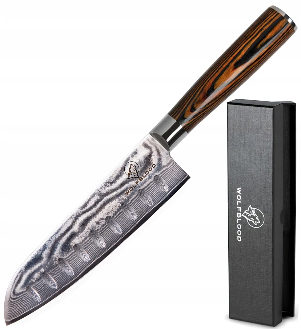Noże Santoku Wolfblood z damasceńskiej stali XL (30 cm) profesjonalny nóż kuchenny z prawdziwej stali damasceńskiej 67 warstw I Damasceńskie noże kuchenne Santoku z drewnianą rączką w eleganckim opakowaniu i osłoną na ostrze