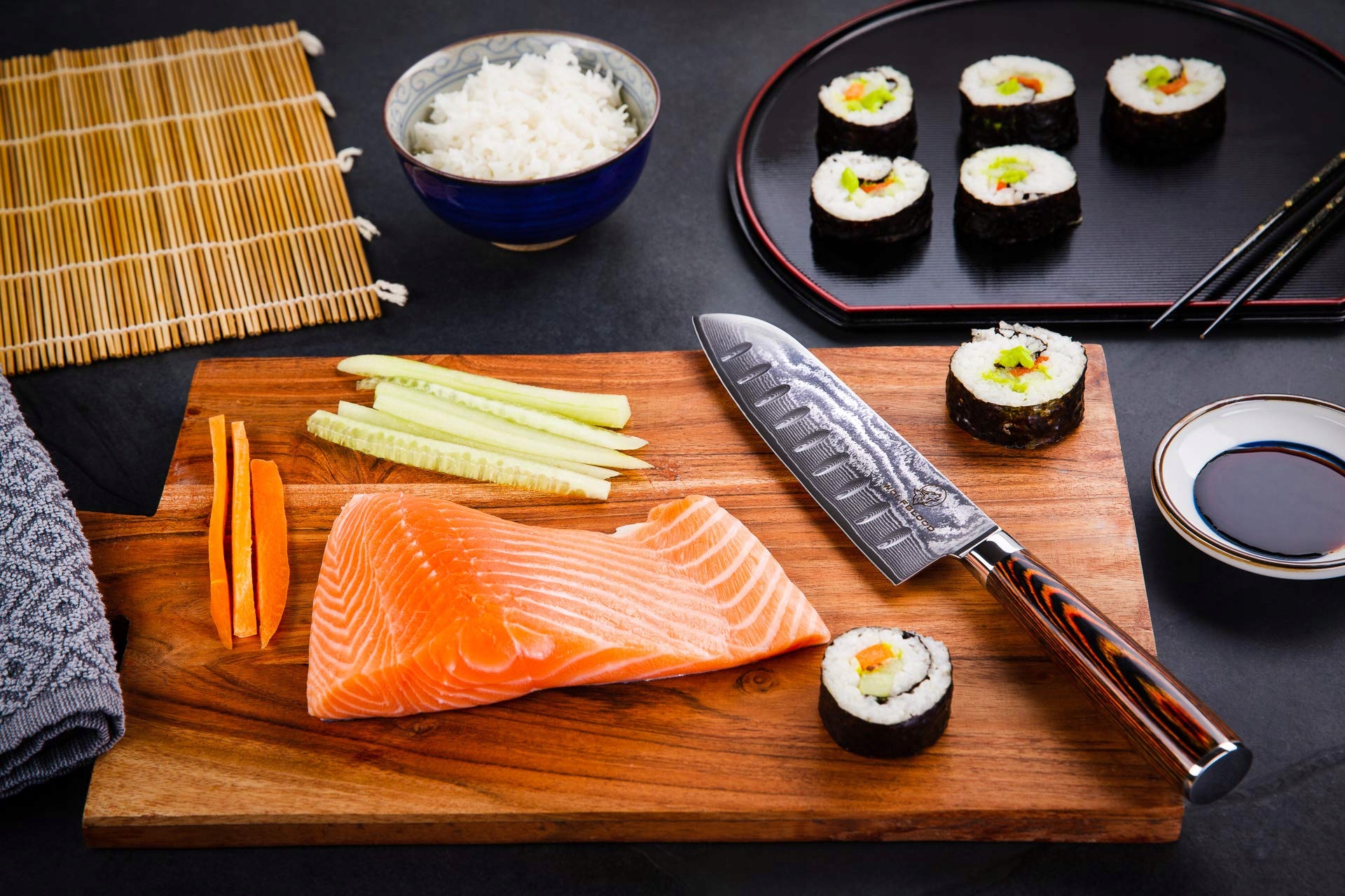 🔪Unikalna ostrość i jakość z Bawarii: Nasze noże kuchenne z damasceńskiej stali są wykonane z starannie wyselekcjonowanej stali damasceńskiej 67 warstw. Wysokiej jakości stal VG 10 nadaje niezwykłą twardość 60±2 HRC, co oznacza, że nóż Santoku bez trudu kroi różnorodne składniki (ryby, mięso, warzywa i owoce), nie tracąc ostrości. Każde ostrze noża damasceńskiego jest ręcznie szlifowane pod kątem 18° i przechodzi staranną kontrolę jakości w naszej siedzibie w Rosenheim. Nasi eksperci sprawdzają każdy szczegół ręcznie, od ostrości ostrza po dopasowanie rączki.