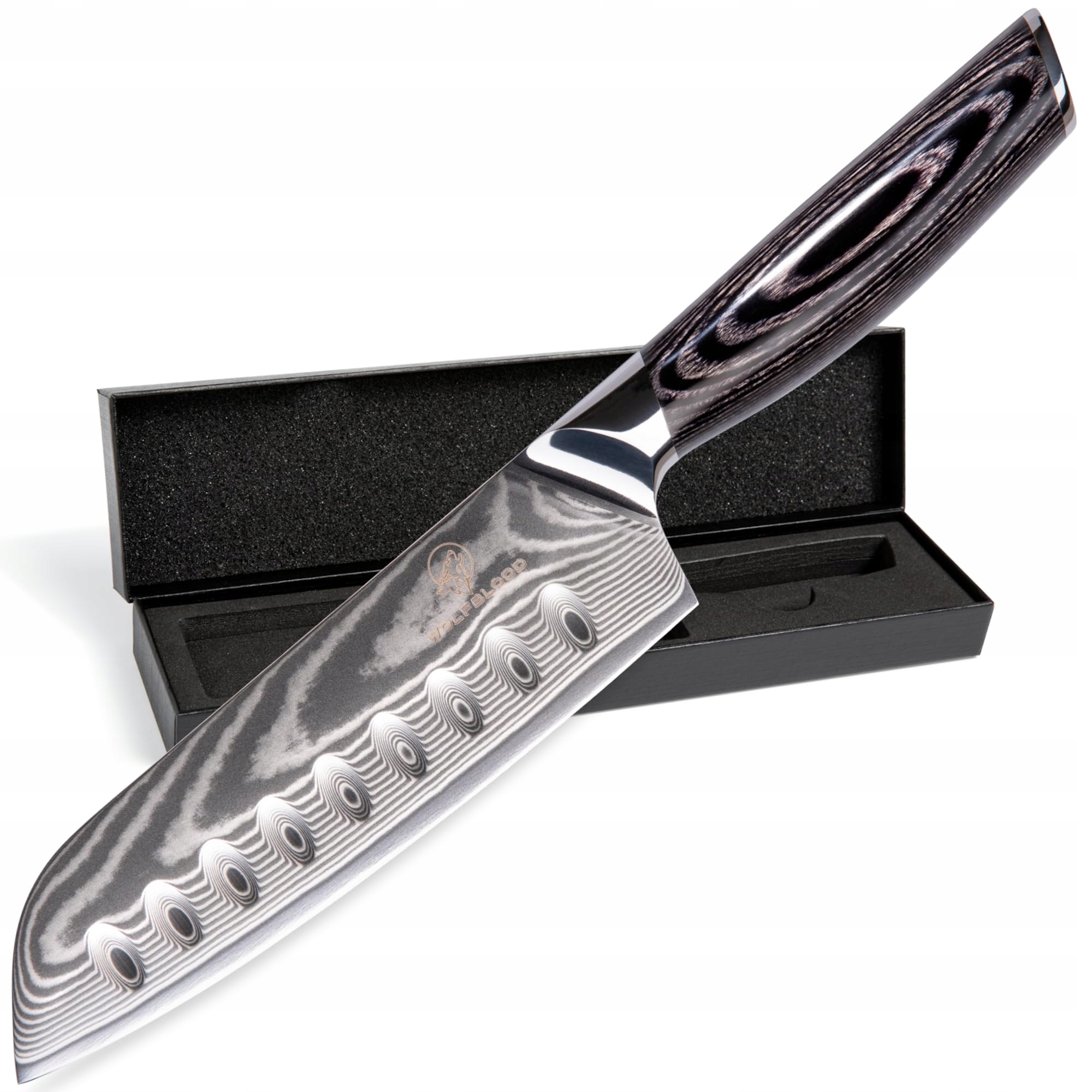 Noż kuchenny Wolfblood PRO z damastu XL (31 cm) profesjonalne noże Santoku z prawdziwej stali damasceńskiej 67 warstw I noże kuchenne Santoku z drewnianą rączką w eleganckim opakowaniu i osłoną na ostrze