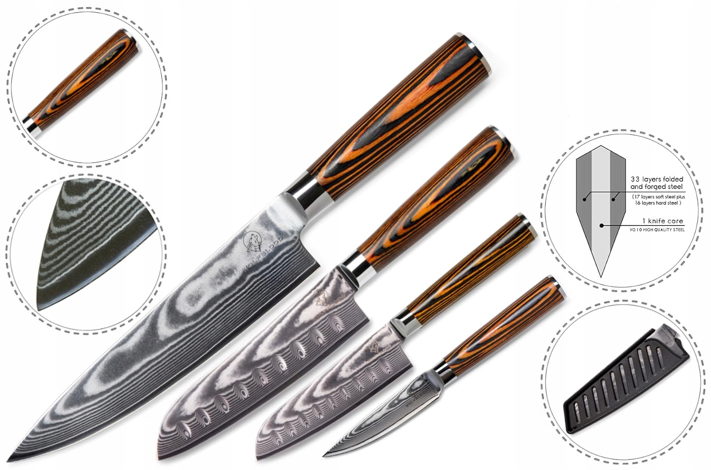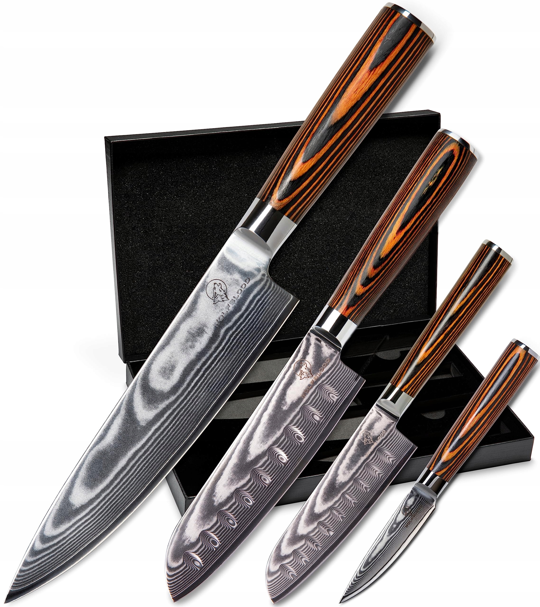 WOLFBLOOD Zestaw Noży Kuchennych Damast 4szt Chef Santoku Ochrona Klingi