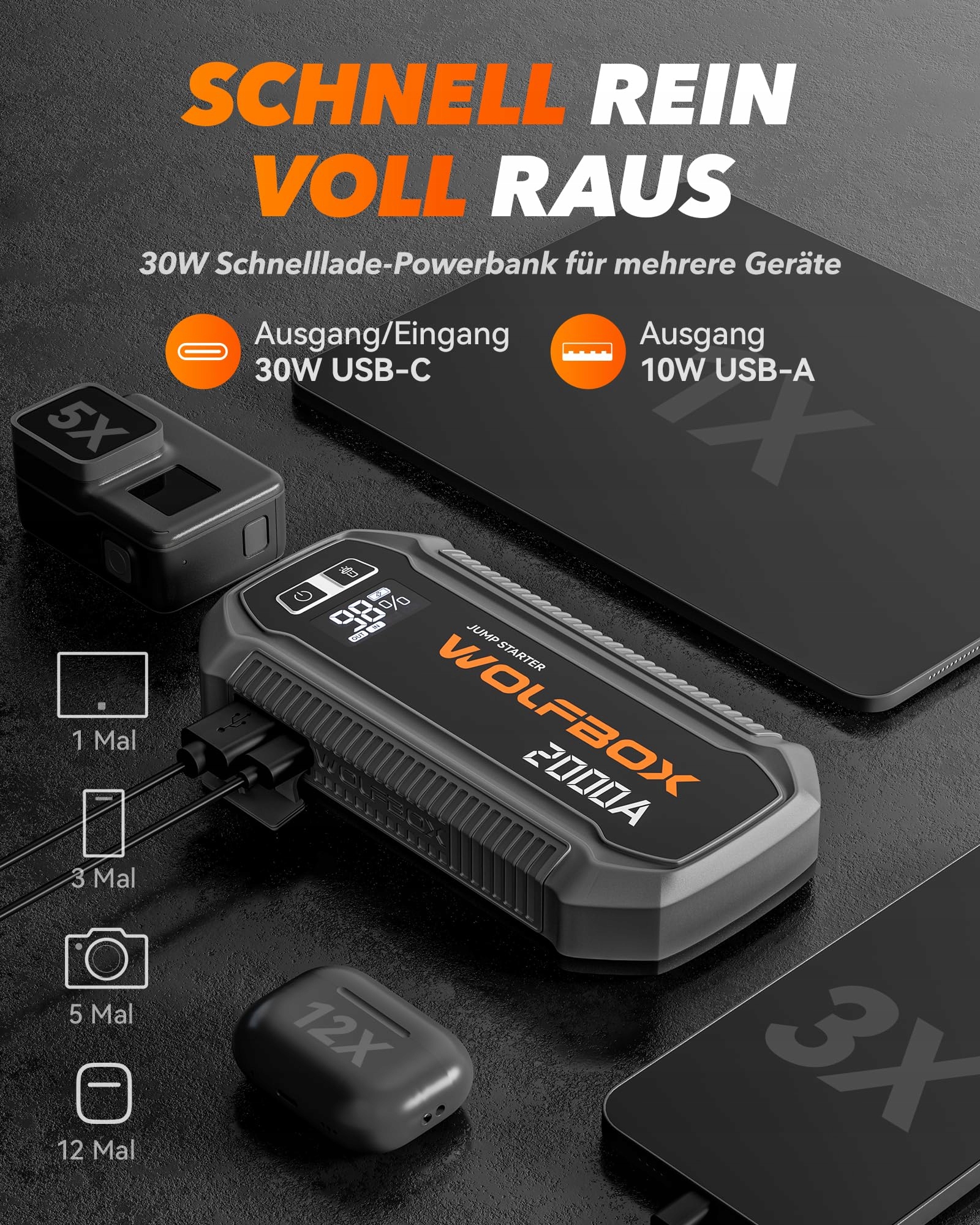 WOLFBOX Powerbank rozruchowa 2000A, 12V rozruch samochodowy (do 7L benzyny/6L diesla) z latarką LED, dużym ekranem, kablami rozruchowymi, boosterem akumulatora samochodowego do samochodów, motocykli, kosiarek