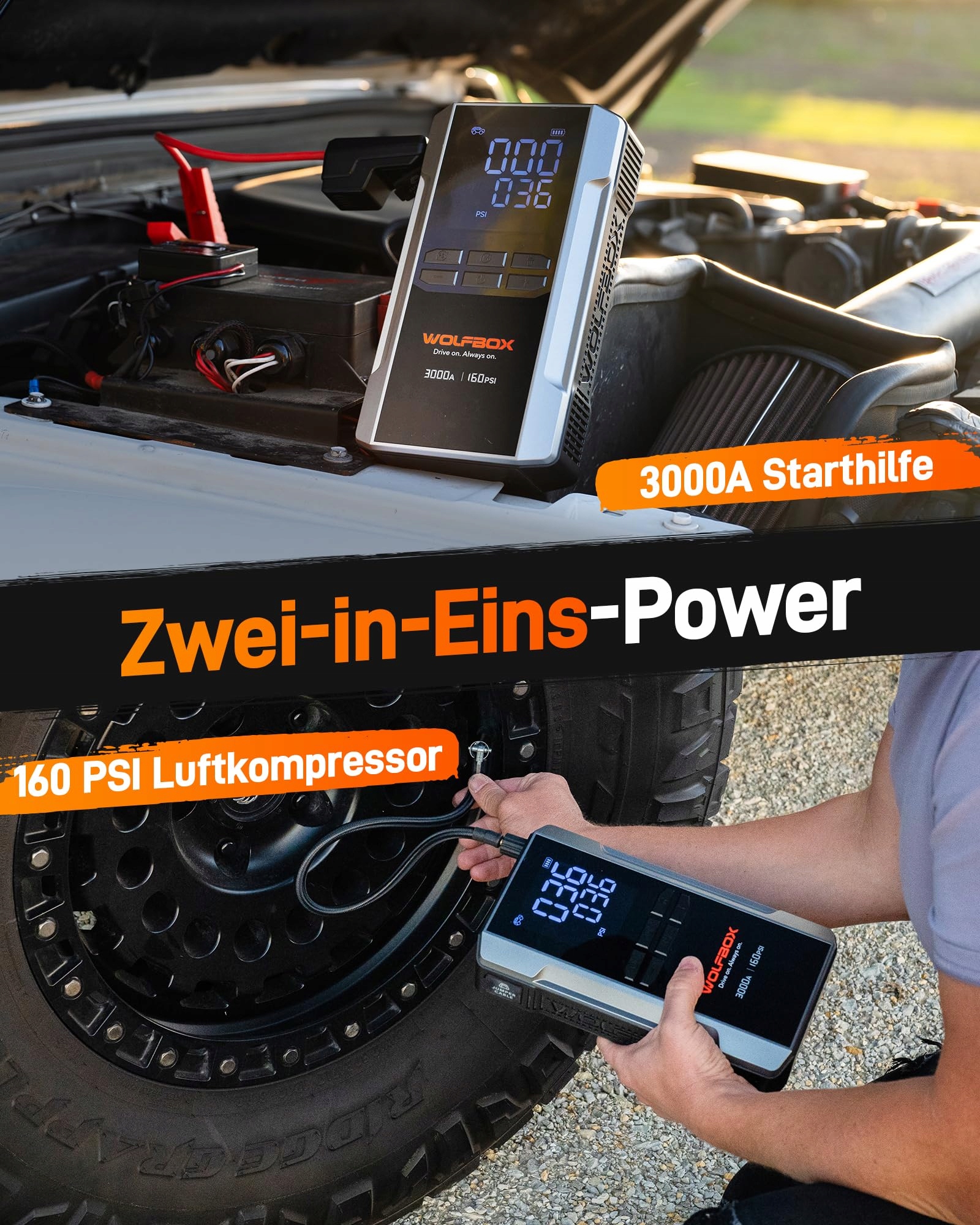 WOLFBOX 3000A Powerbank rozruchowa do samochodów osobowych z kompresorem powietrza 160 PSI, szybkie ładowanie 65 W, pojemność 59,2 Wh, do silników benzynowych 8 L / diesla 6 L, z wyświetlaczem LED i światłem awaryjnym 400 lumenów