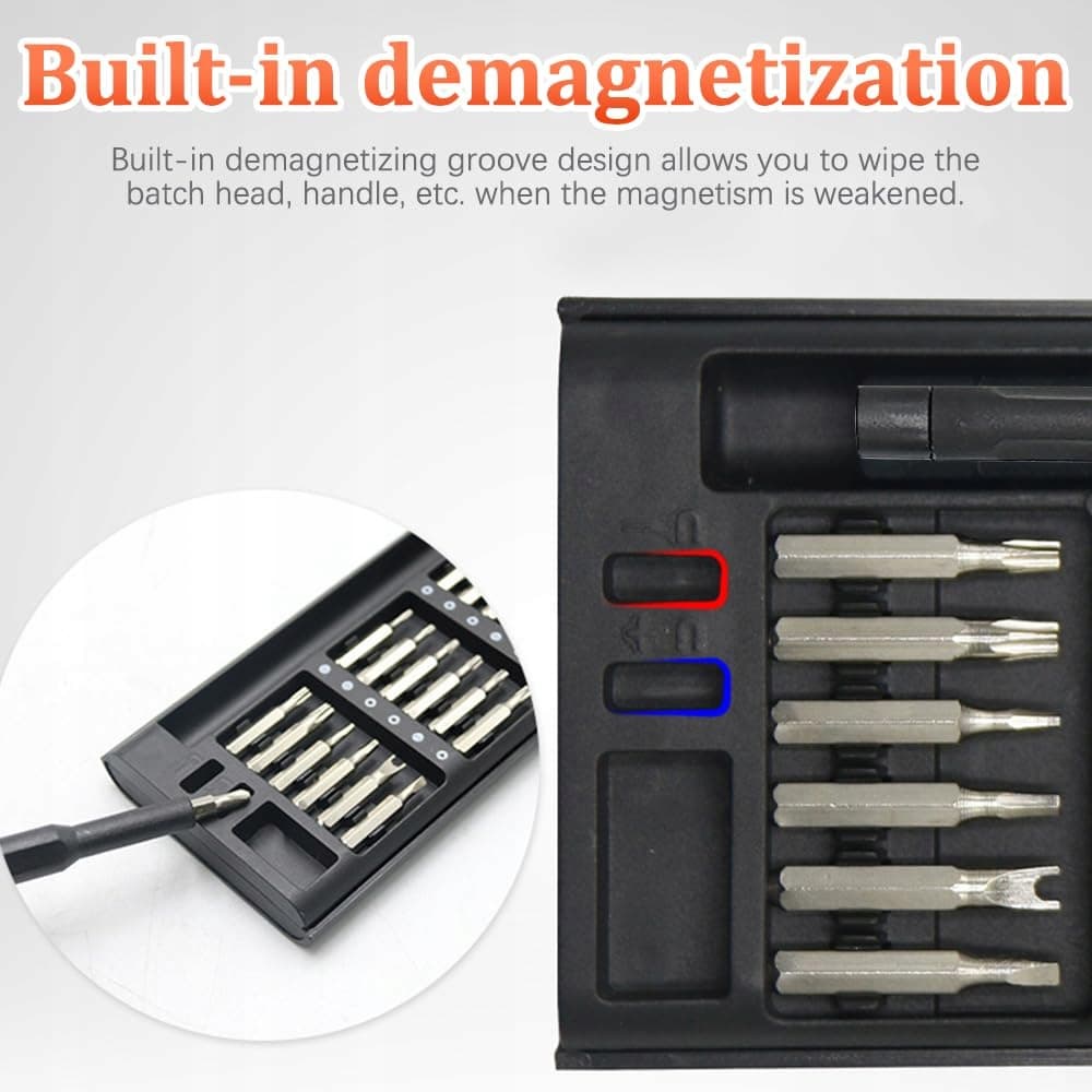 Bezpieczny uchwyt na końcówki: Uchwyt na końcówki naszego precyzyjnego wkrętaka jest wyposażony w kulkowy mechanizm blokujący, który trzyma końcówki na swoim miejscu i zapewnia precyzję, której wymaga Twoja praca. Ponadto wbudowany magnes przenosi magnetyzm przez końcówkę, dzięki czemu możesz łatwo przykręcać i zapobiegać zgubieniu małych śrub.