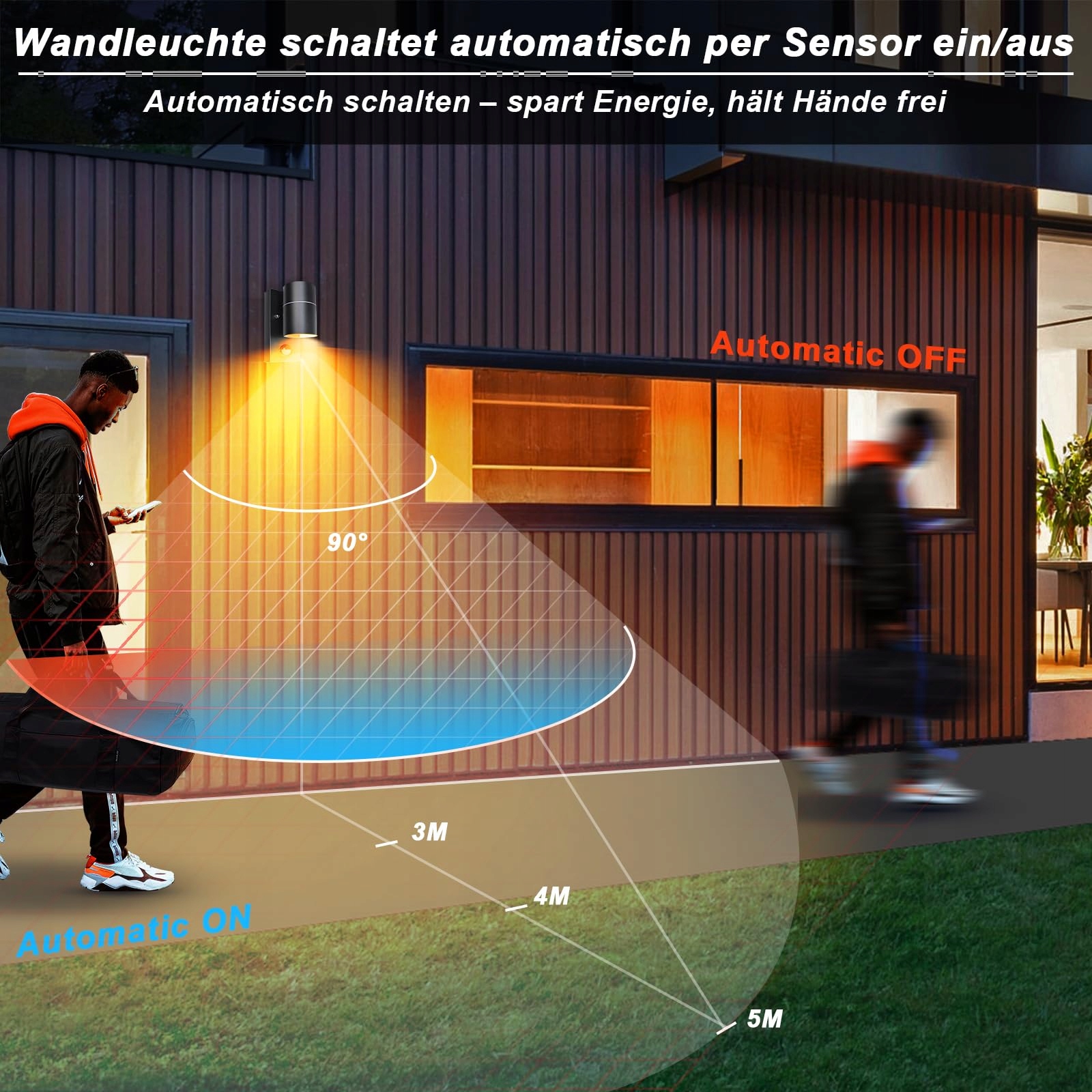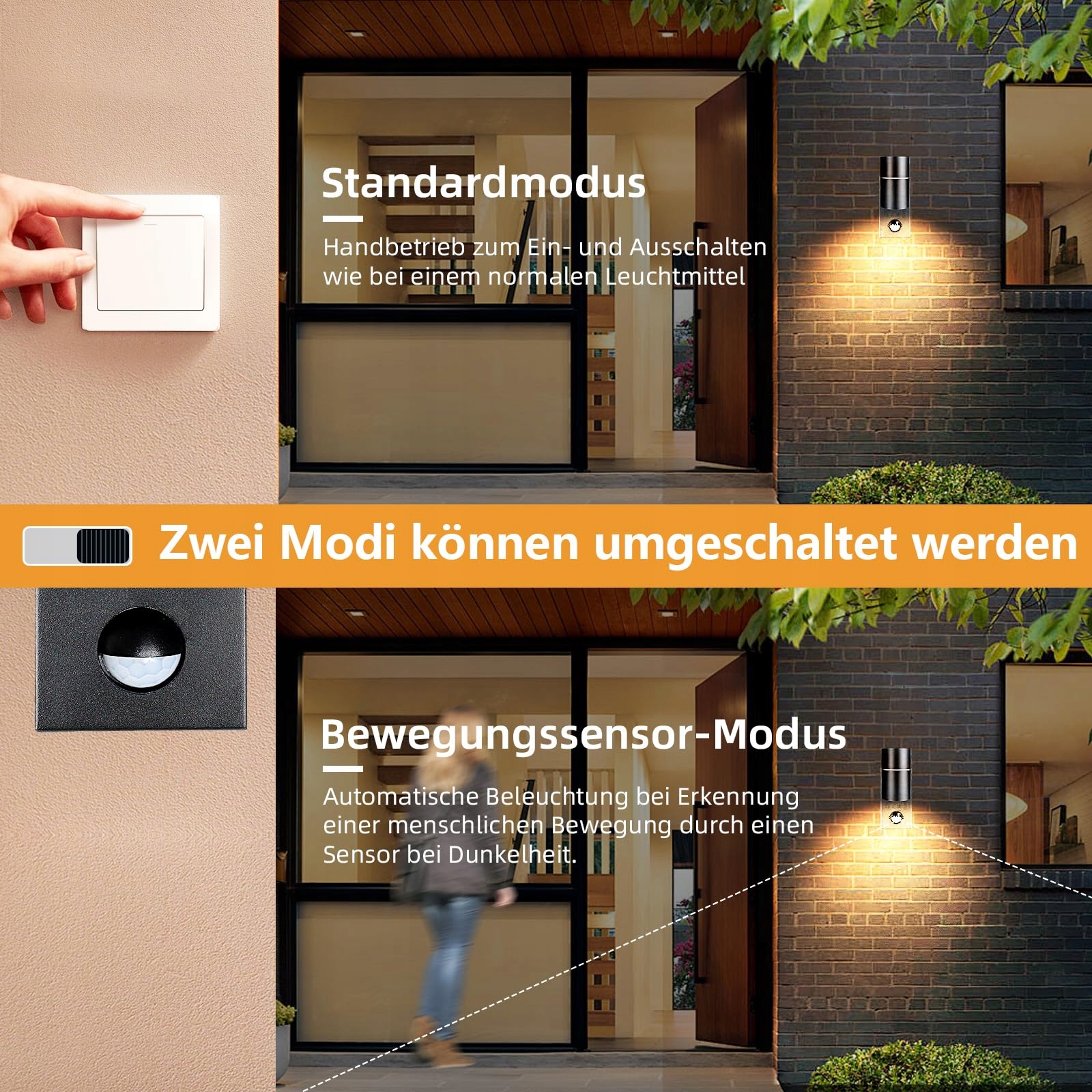 【Lampa zewnętrzna z czujnikiem ruchu】Automatyczne włączanie przy wykryciu ruchu człowieka (pasywny czujnik podczerwieni). Konfigurowalny czas świecenia (60 s) oraz konfigurowalny tryb oświetlenia (tryb nocny lub tryb dzień/noc według LUX).