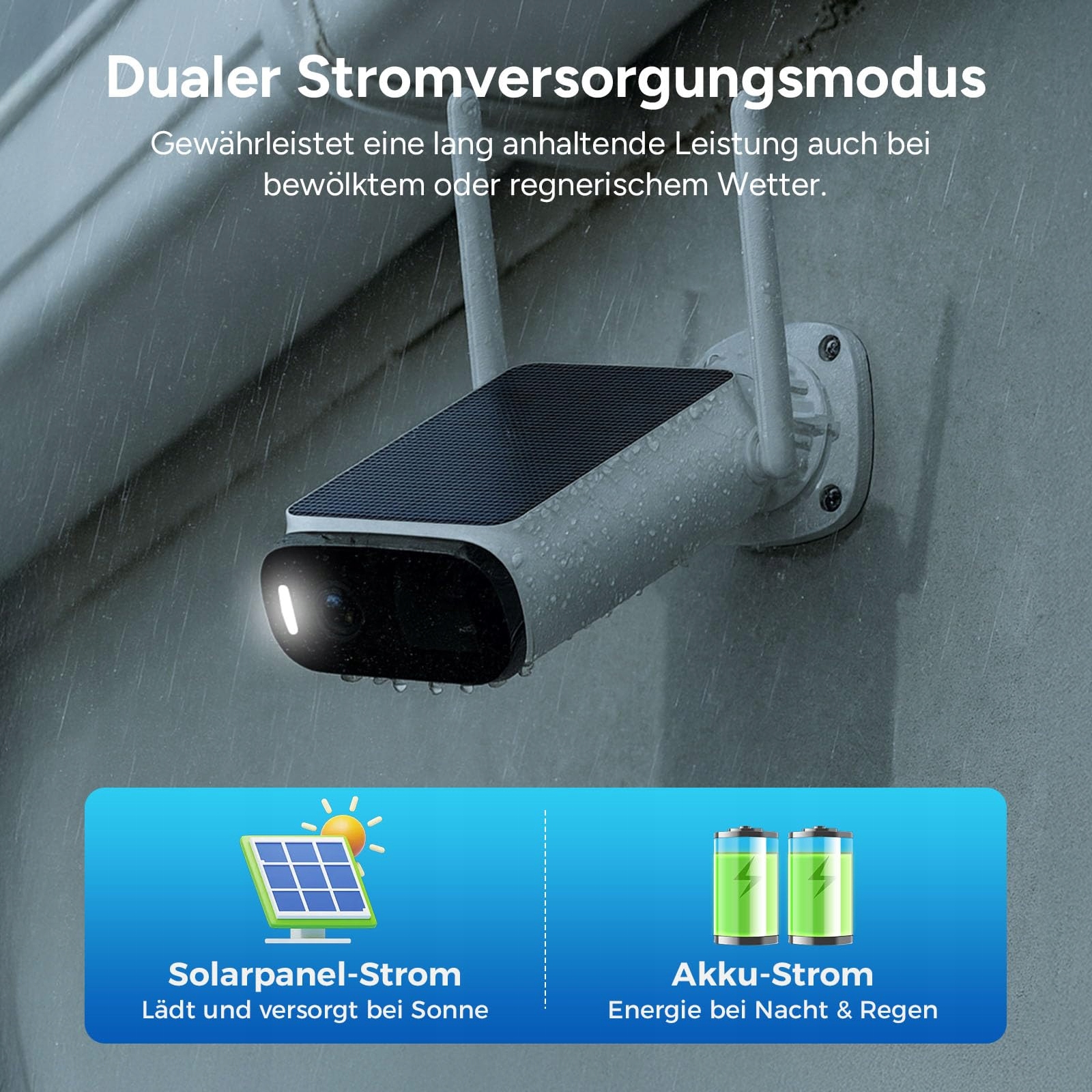 Całodobowy monitoring solarny bez podłączenia do prądu: Ta kamera solarna na zewnątrz jest wyposażona w panel solarny i akumulator. Już około 2,5 godziny światła słonecznego dziennie wystarcza, aby zapewnić całoroczną pracę kamery monitorującej na zewnątrz zasilanej energią słoneczną. Energooszczędna konstrukcja umożliwia działanie nawet w pochmurne lub deszczowe dni przez okres do dwóch miesięcy bez bezpośredniego nasłonecznienia.