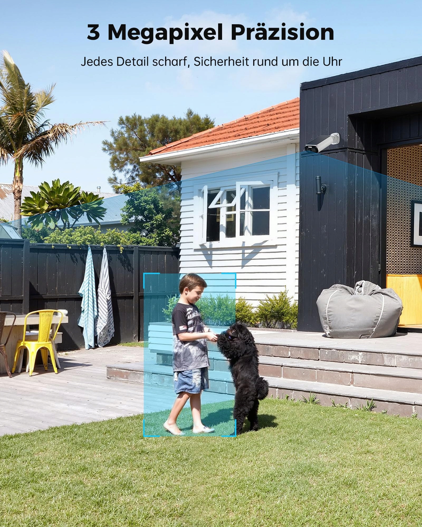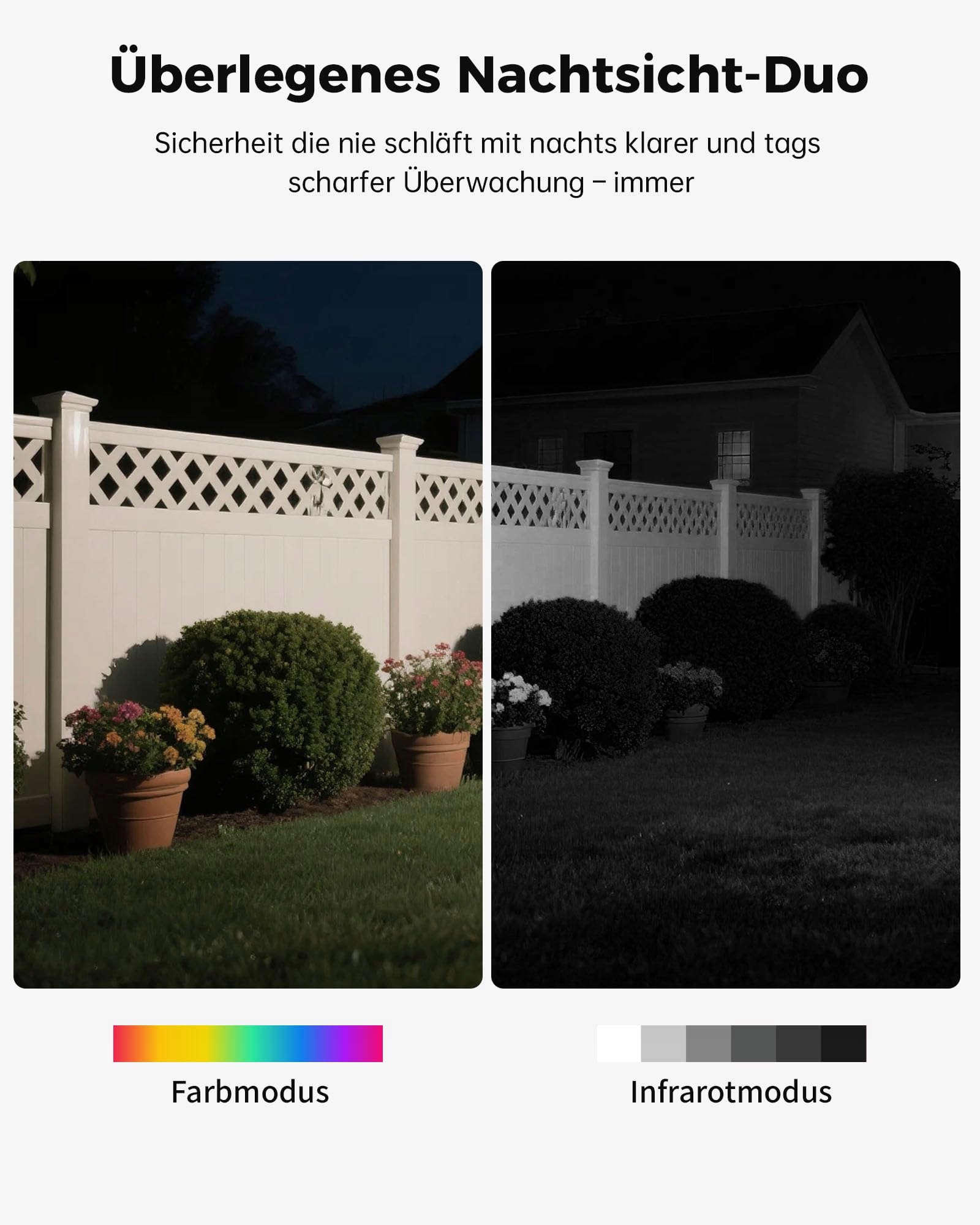 2K-Ultra-HD i szeroki kąt 130°: Nasza kamera zewnętrzna solarna jest wyposażona w obiektyw szerokokątny 3 megapiksele oraz wbudowany reflektor, który zapewnia kolorowe widzenie nocne – zarówno w dzień, jak i w nocy dostarcza wyraźny i ostry obraz. Szeroki kąt 130° obejmuje duże obszary zewnętrzne i oferuje kompleksowy monitoring bez martwych stref.