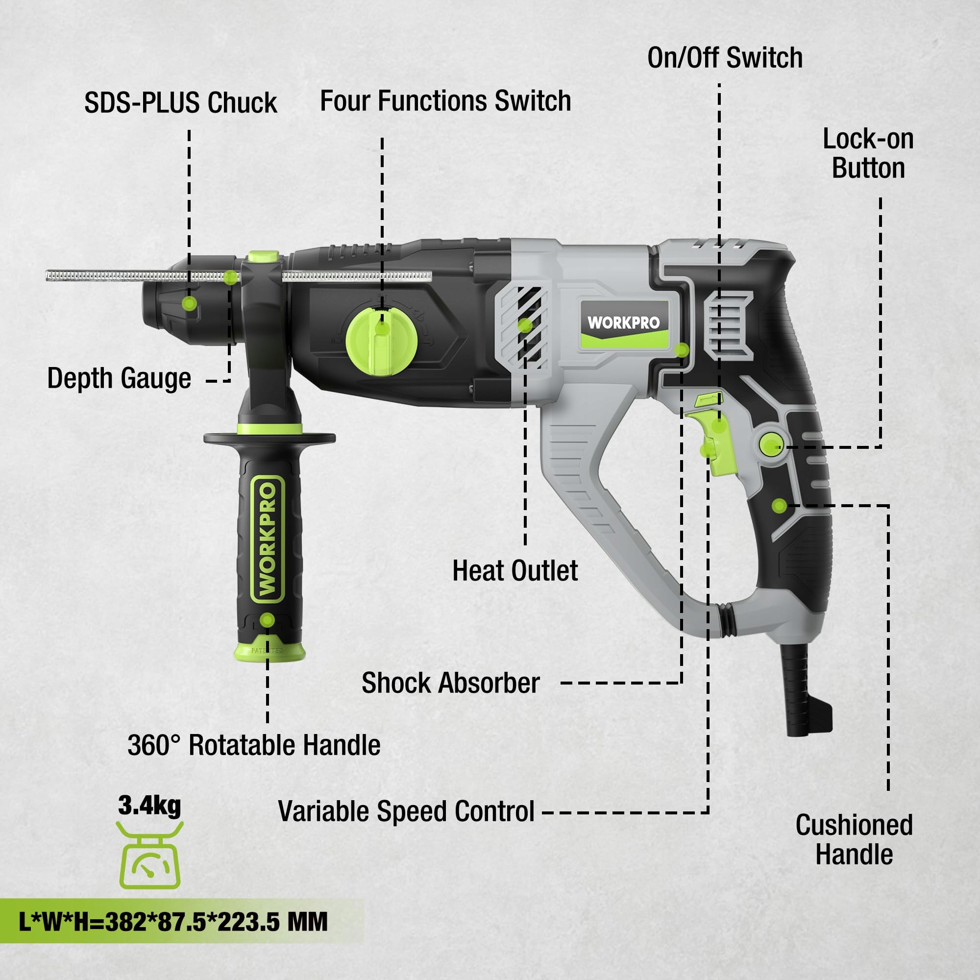 WORKPRO młotowiertarka SDS-Plus 1050W, młot wyburzeniowy młot do betonu wiertarka 3 Joule, zmienna prędkość, uchwyt regulowany 360°, z akcesoriami, dłuto i walizka, 1150 R/Min, 5100BPM, w betonie 26mm