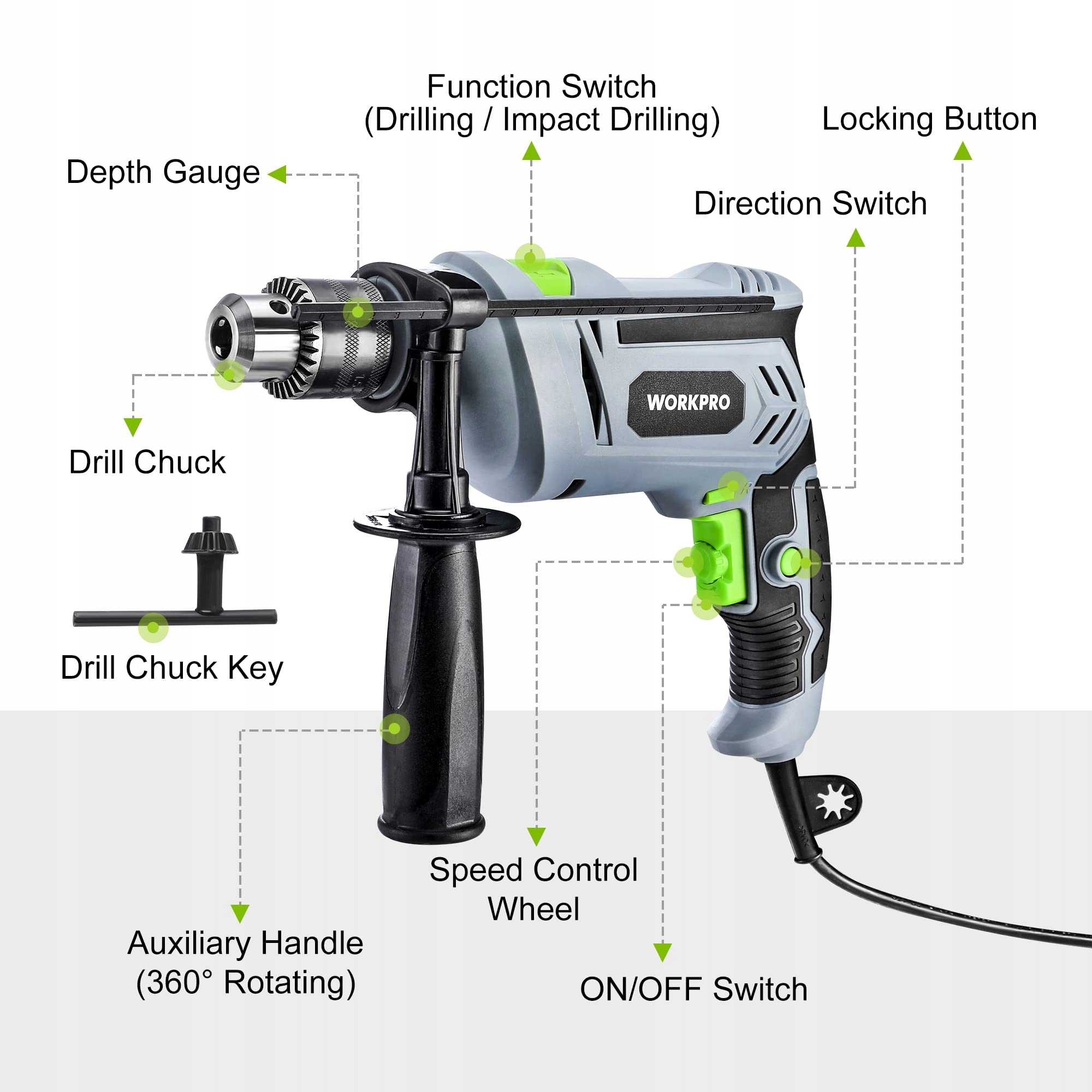 WORKPRO Młotowiertarka 850W, Wiertarka 3000RPM, 2 w 1 Młot i Wiertło z uchwytem obrotowym 360°, uchwyt wiertarski 13mm, w tym 3 wiertła spiralne i 2 wiertła do betonu