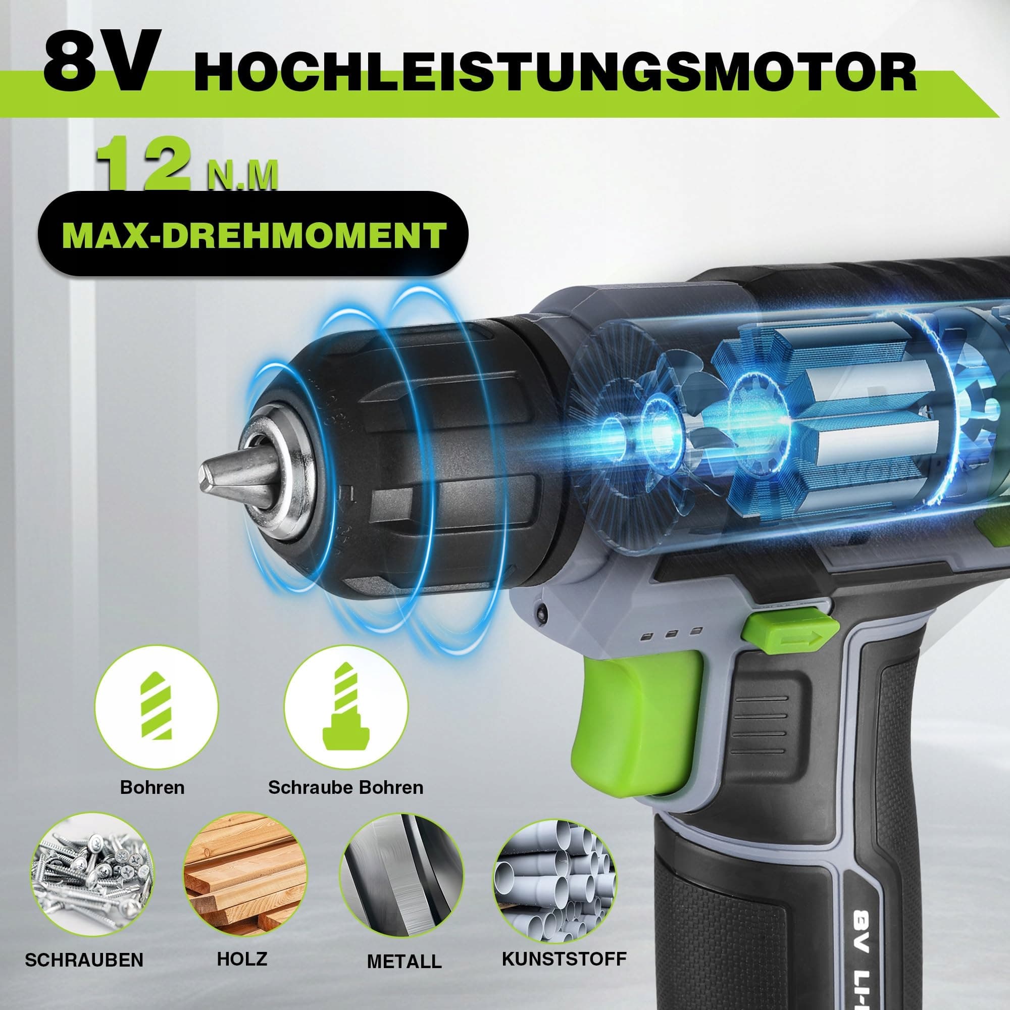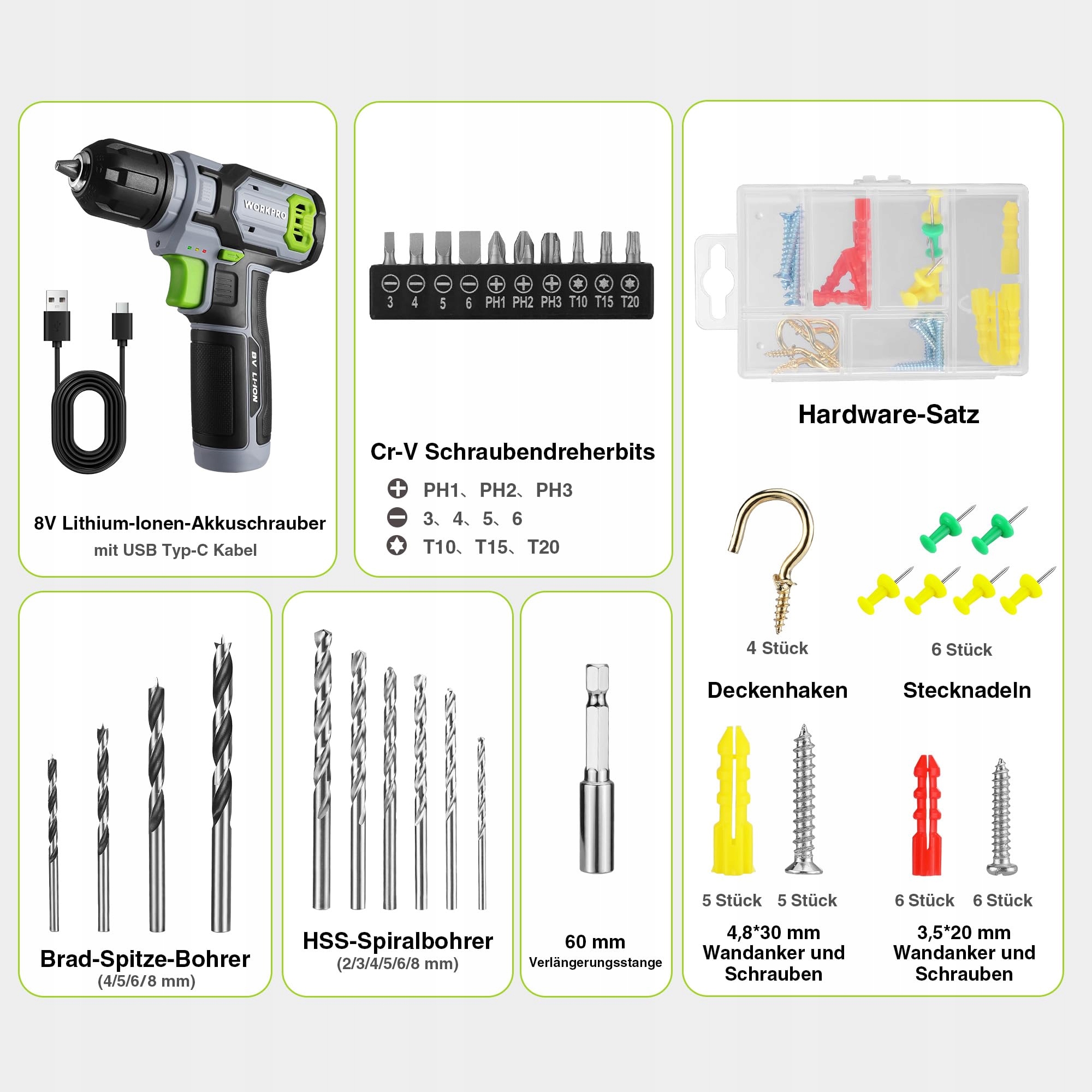 Zestaw akcesoriów 53-częściowy: Zestaw wiertarski zawiera wkrętarkę akumulatorową 8V, kabel do ładowania typu C i 53 ważne akcesoria, takie jak bity śrubokrętowe Cr-V, wiertła, pręt przedłużający, śruby rozprężne, kołki i haki sufitowe