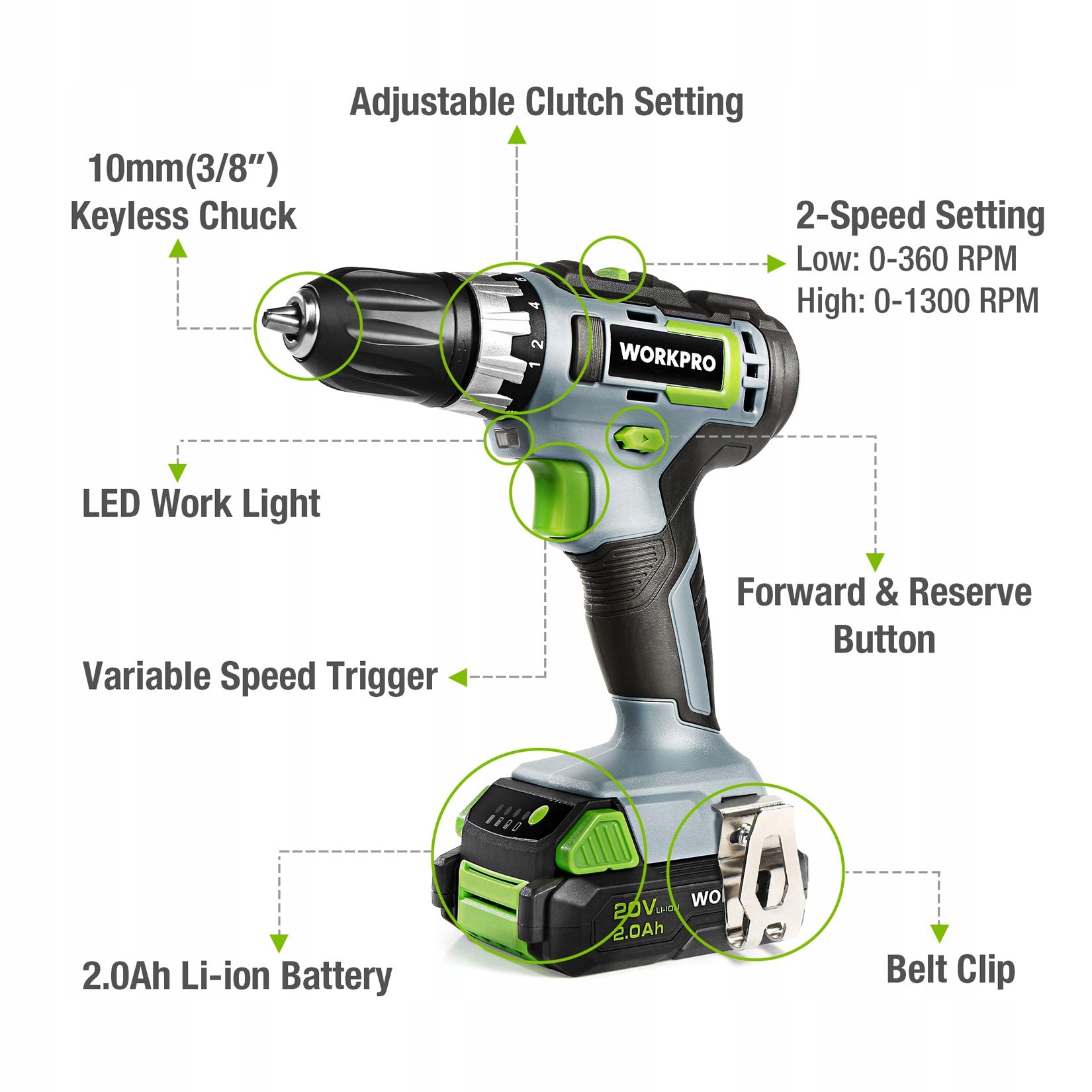 Wkrętarka WORKPRO 18V/20V z akumulatorem, 16 akcesoriów, moment obrotowy 25NM i zmiennymi prędkościami obrotowymi, światło LED, 2 kierunki obrotów, w tym akumulator Li-Ion 2,0Ah i szybka ładowarka
