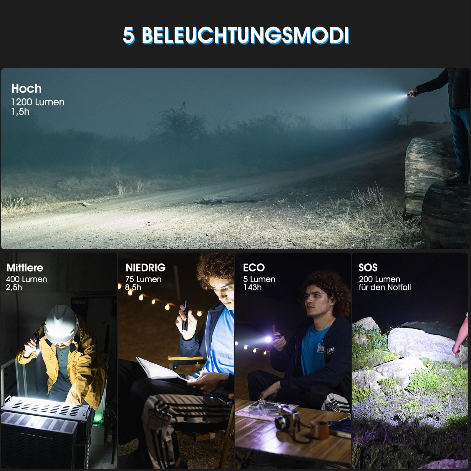 5 TRYBÓW I DŁUGI PROMIEŃ: Ta ładowana latarka w formacie kieszonkowym oferuje 5 trybów oświetlenia: Wysoki/Średni/Niski/ECO/SOS. Projekt przełącznika z tyłu zapewnia płynniejsze użytkowanie. Zmień tryb lekkim dotknięciem i korzystaj z funkcji pamięci. Po ponownym uruchomieniu nie musisz wielokrotnie zmieniać biegu.
