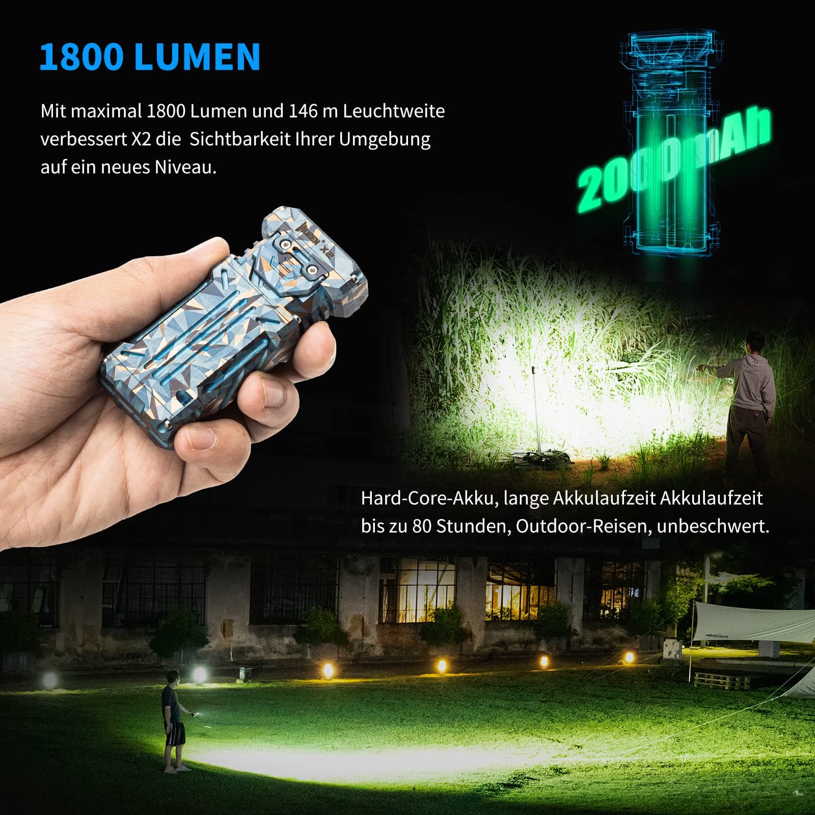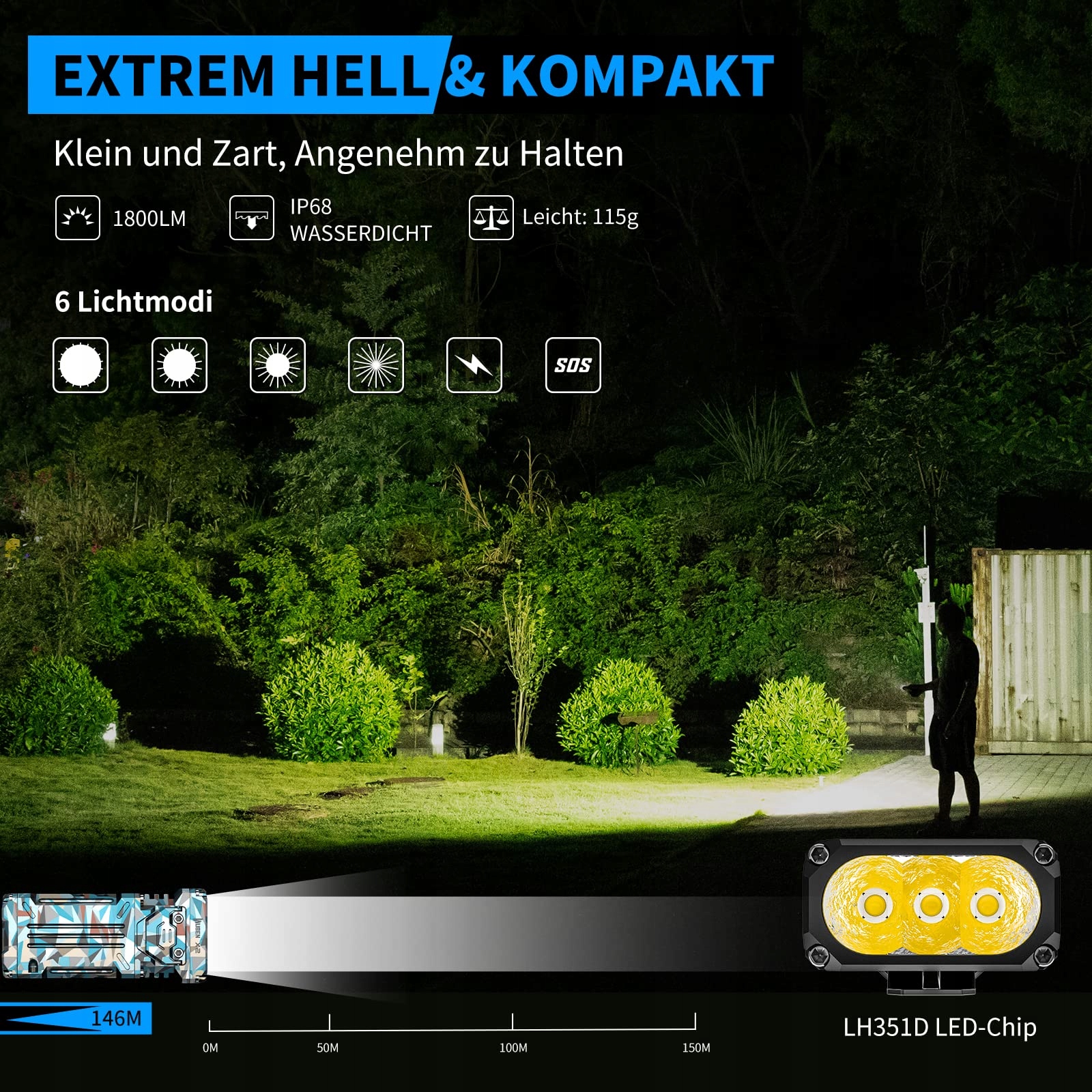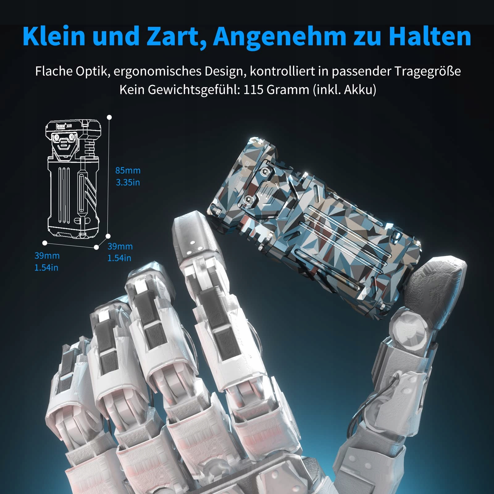 INNOWACYJNA PRZENOŚNA LATARKA: Nie tylko latarka, ale unikalne i innowacyjne przenośne światło: Wuben X2 to mała i wydajna latarka do codziennego użytku. Małe EDC, kompaktowe i łatwe do przenoszenia. Jej wymiary to 85 mm x 39 mm x 20 mm, a waga to tylko 115 gramów. Maksymalna moc wynosi 2500 lumenów, a maksymalny zasięg to 146 metrów