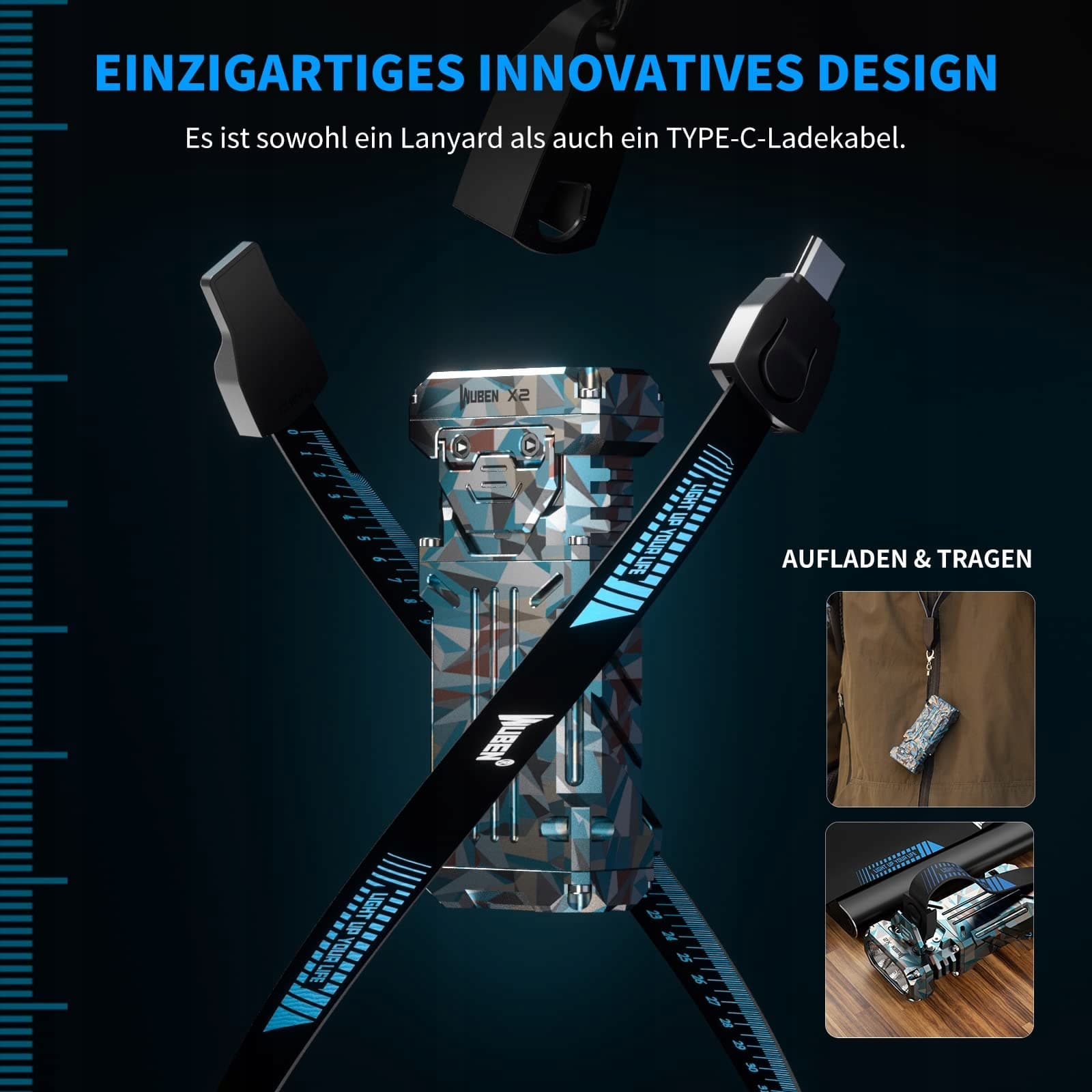 6 TRYBÓW I INTELIGENTNE ŚWIATŁA WYKRYWAJĄCE: WUBEN X2 posiada 4 popularne tryby oświetlenia: niski, średni, wysoki, turbo oraz 2 tryby migania: stroboskop i SOS. Niezależnie od tego, czy jesteś w podróży, czy w domu, gotowy na przygody lub spacerujesz z psem, z X2 jesteś doskonale przygotowany! Wskaźnik baterii LED pokazuje niebieskie lub czerwone światło, migające lub stałe, w zależności od stanu baterii, dzięki czemu możesz kontrolować zasilanie przez cały dzień