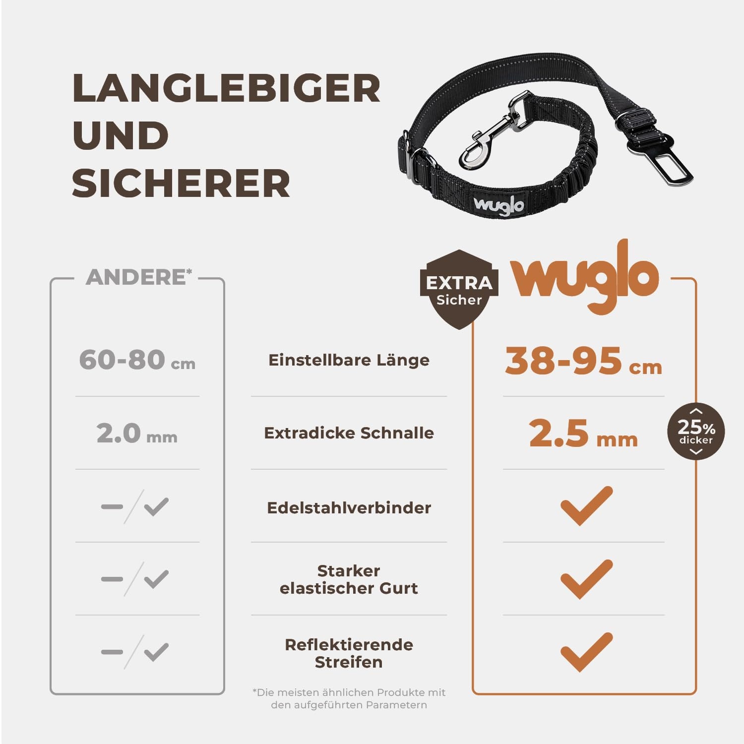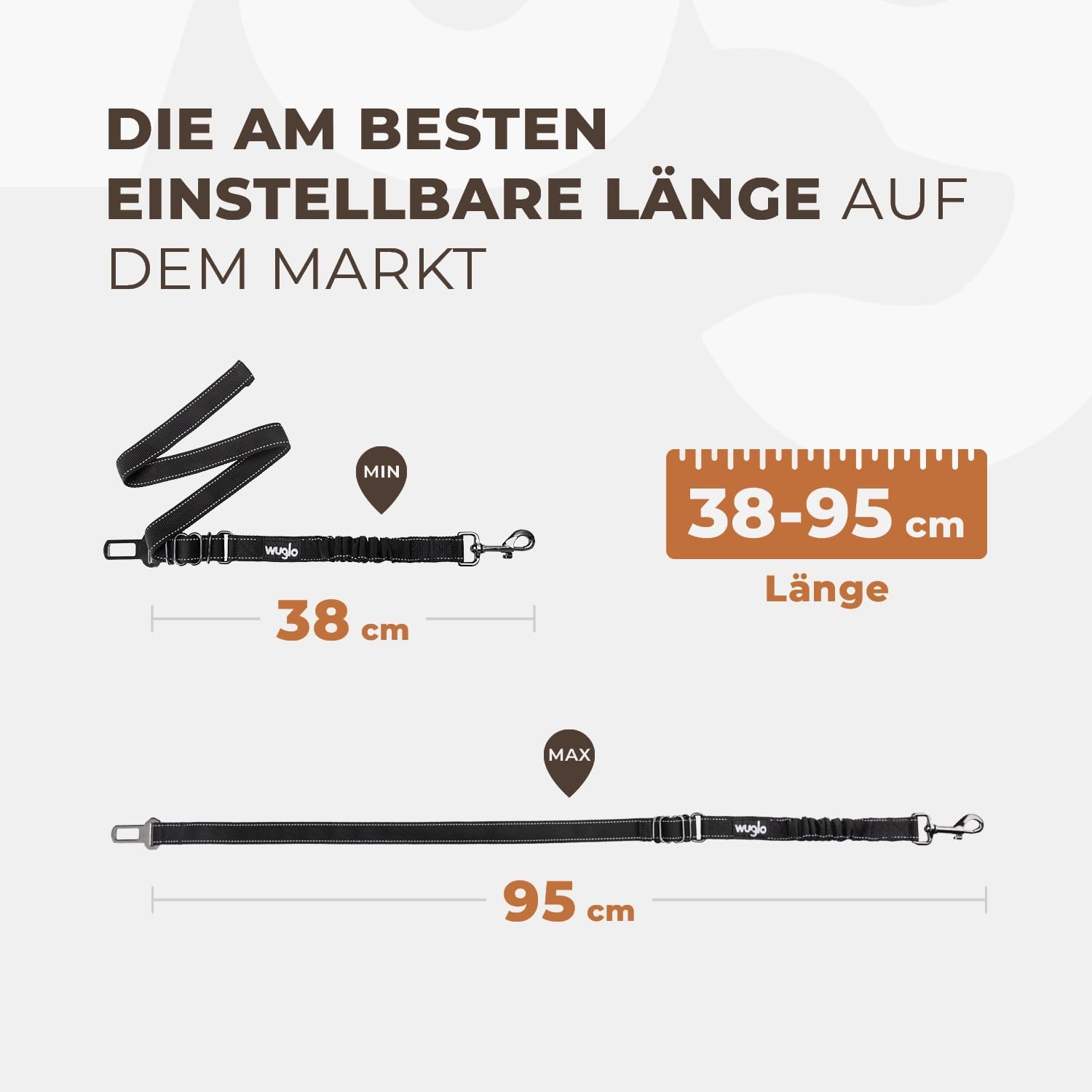 ŁATWO ZMIENIALNA DŁUGOŚĆ (38-95 cm) - Szelki samochodowe dla psa Wuglo mają unikalny design, który można zmienić w zaledwie kilka sekund. Dzięki naszemu pasowi samochodowemu dla psa, Twój zwierzak podróżuje wygodnie i bezpiecznie.