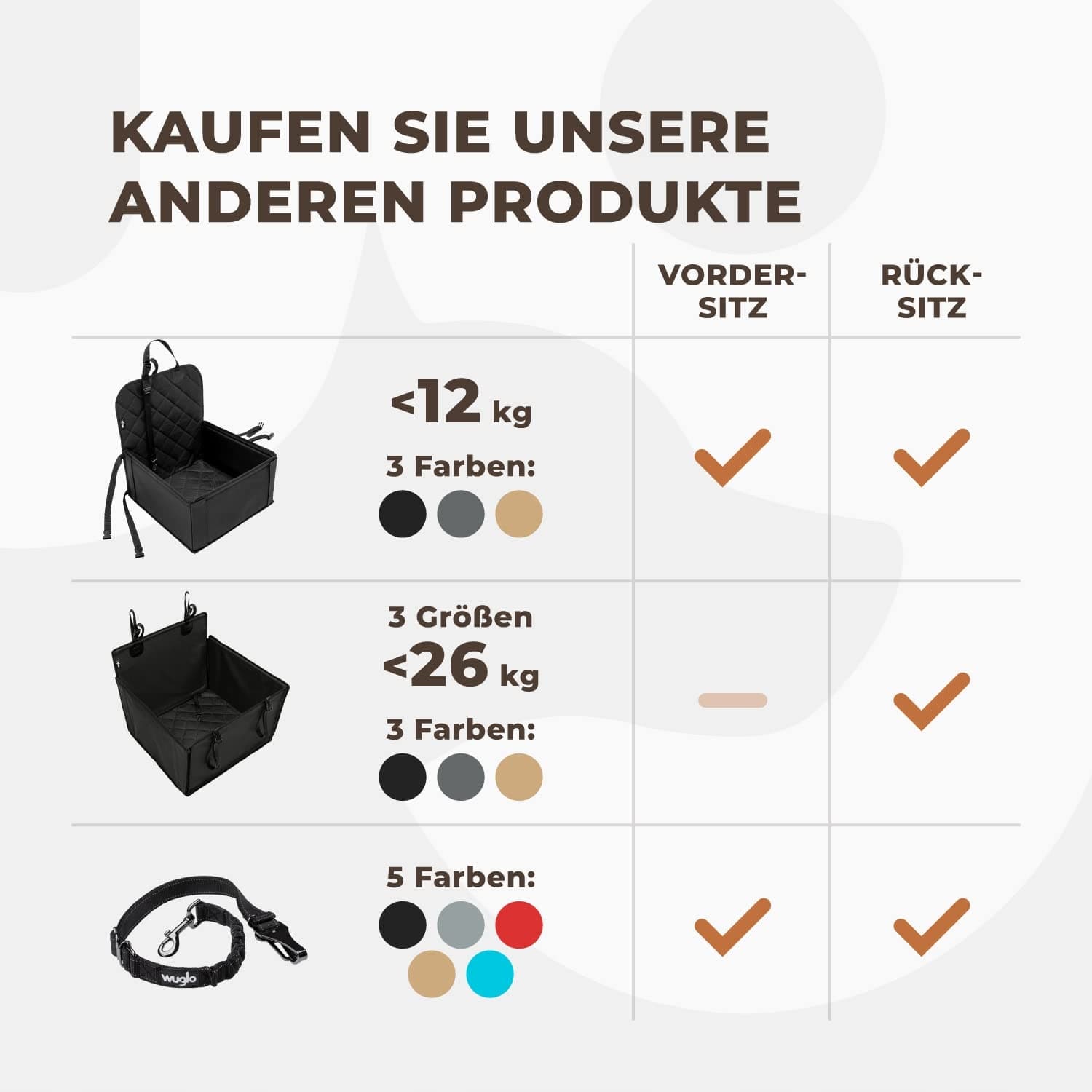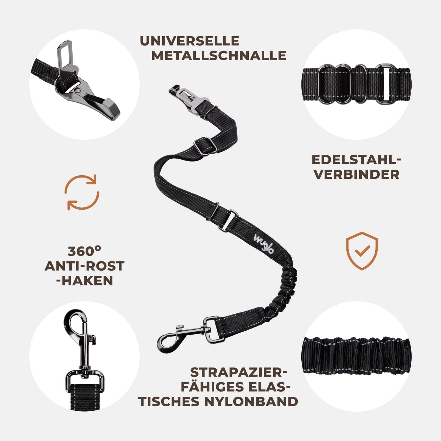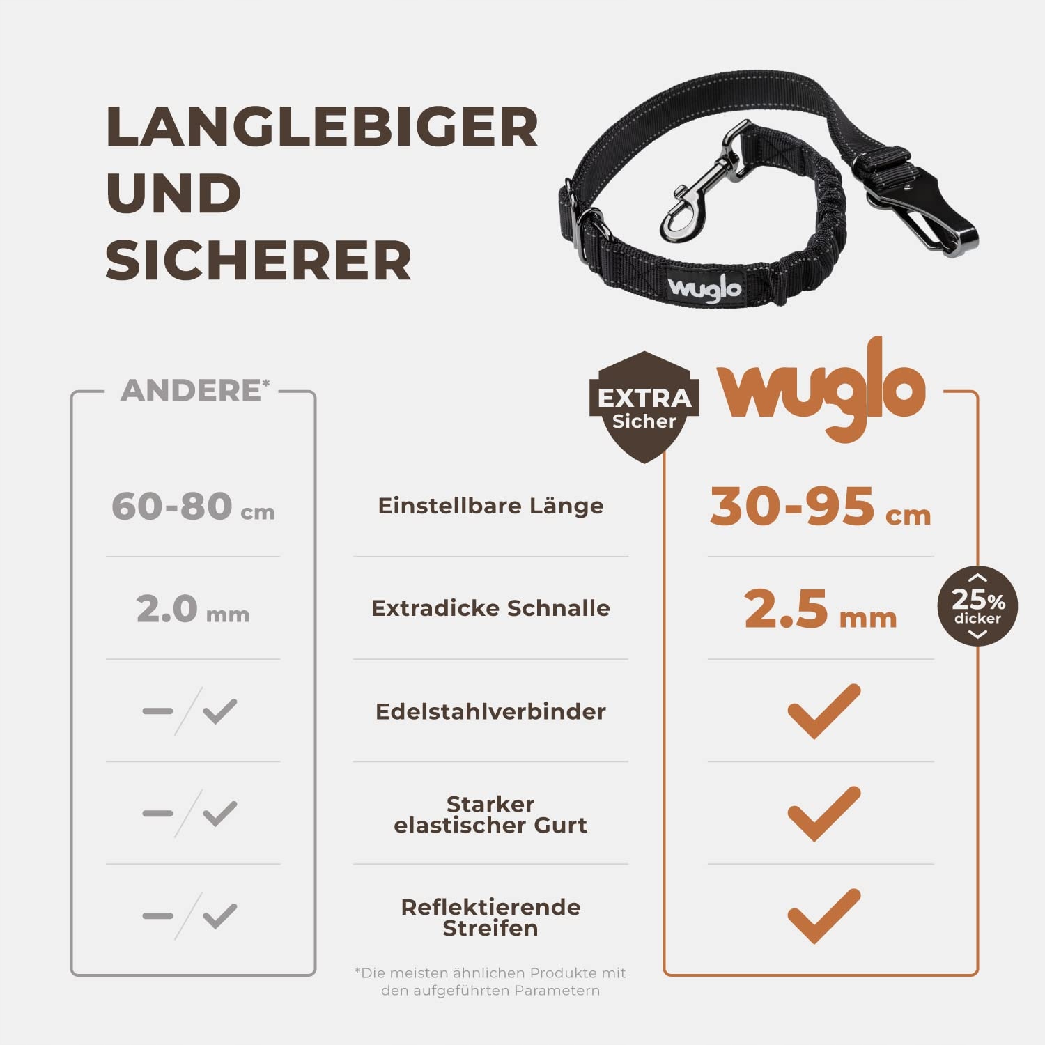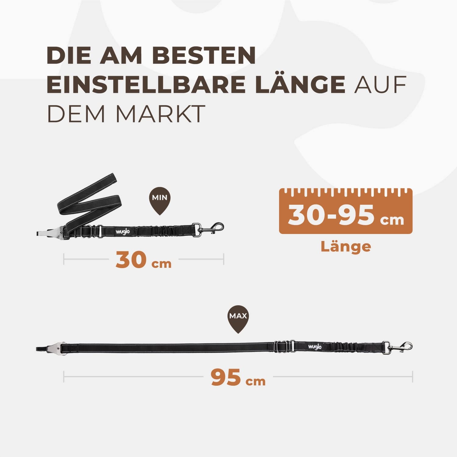 ŁATWO ZMIENIALNA DŁUGOŚĆ (30-95 cm) - Szelki samochodowe dla psa Wuglo mają unikalny design, który można zmienić w zaledwie kilka sekund. Dzięki naszemu pasowi samochodowemu dla psa, Twój zwierzak podróżuje wygodnie i bezpiecznie.