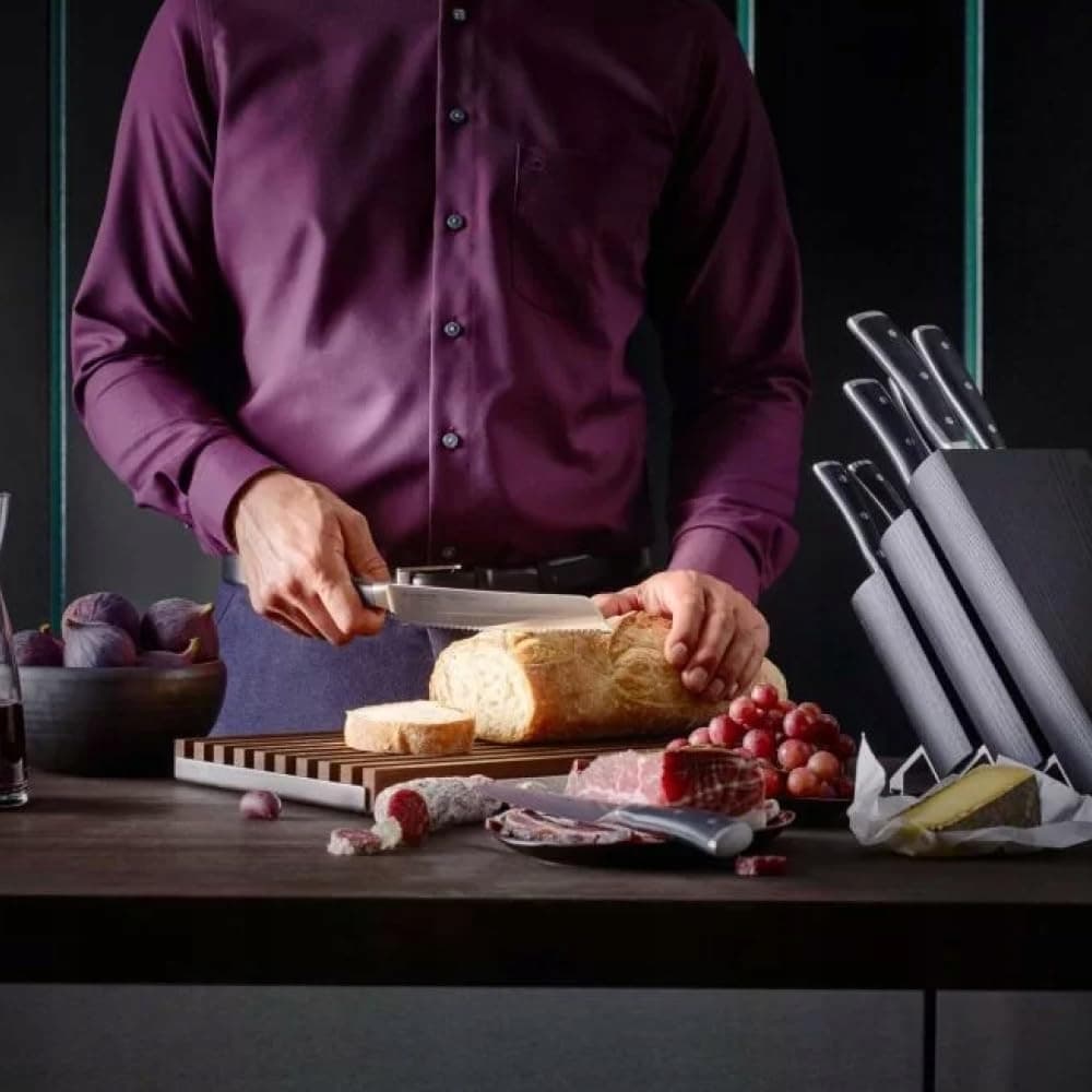 Wygładzone rowki (małe wgłębienia) tworzą poduszki powietrzne i zapobiegają przyklejaniu się cienkich plasterków. Ergonomiczny uchwyt – dzięki małemu wygięciu w przedniej części, ultra ostry nóż krojony leży szczególnie pewnie w dłoni