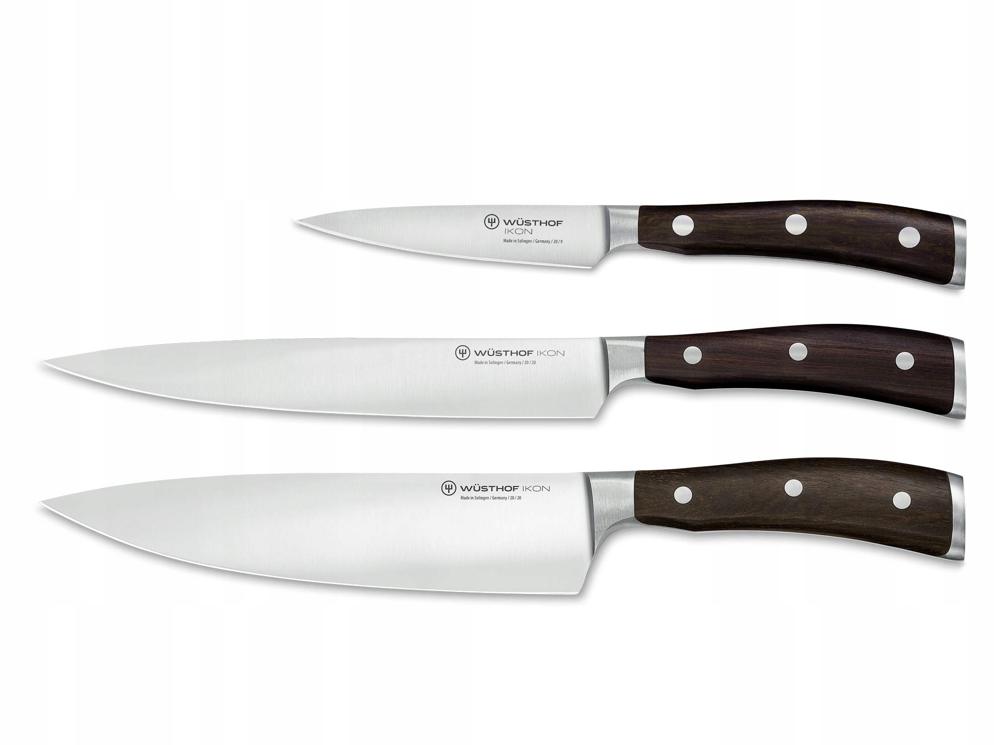 Zestaw noży Ikon zawiera 3 stylowe noże: 1 duży nóż kuchenny (z 20 cm klingą) jako nóż uniwersalny, 1 nóż do szynki (20 cm) jako mocny nóż specjalistyczny do mięsa oraz zwrotny nóż do warzyw (9 cm) z ostrzem zwężającym się ku końcowi