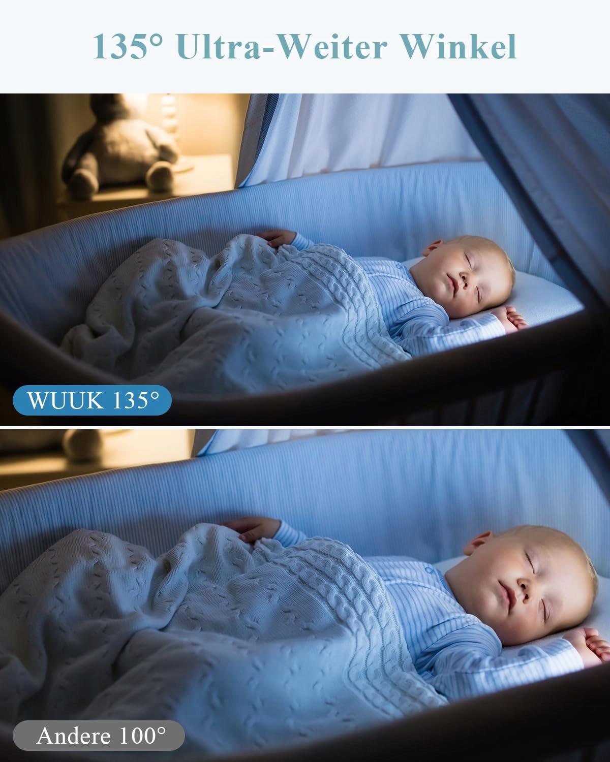 [Zobacz więcej szczegółów na większym i szerszym monitorze]--- WUUK wideo-niania z ultra szerokim obiektywem 135°, sprawdź szerszy obraz na monitorze/aplikacji telefonicznej w porównaniu do innych kamer o kącie 100°. 5,5'' wyświetlacz, wideo w jakości 720P HD, nawet oddech dziecka można wyraźnie zobaczyć.