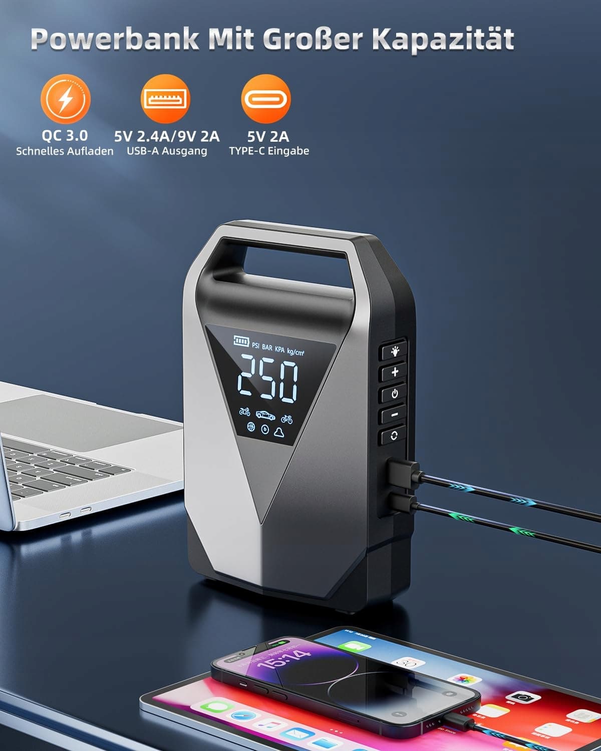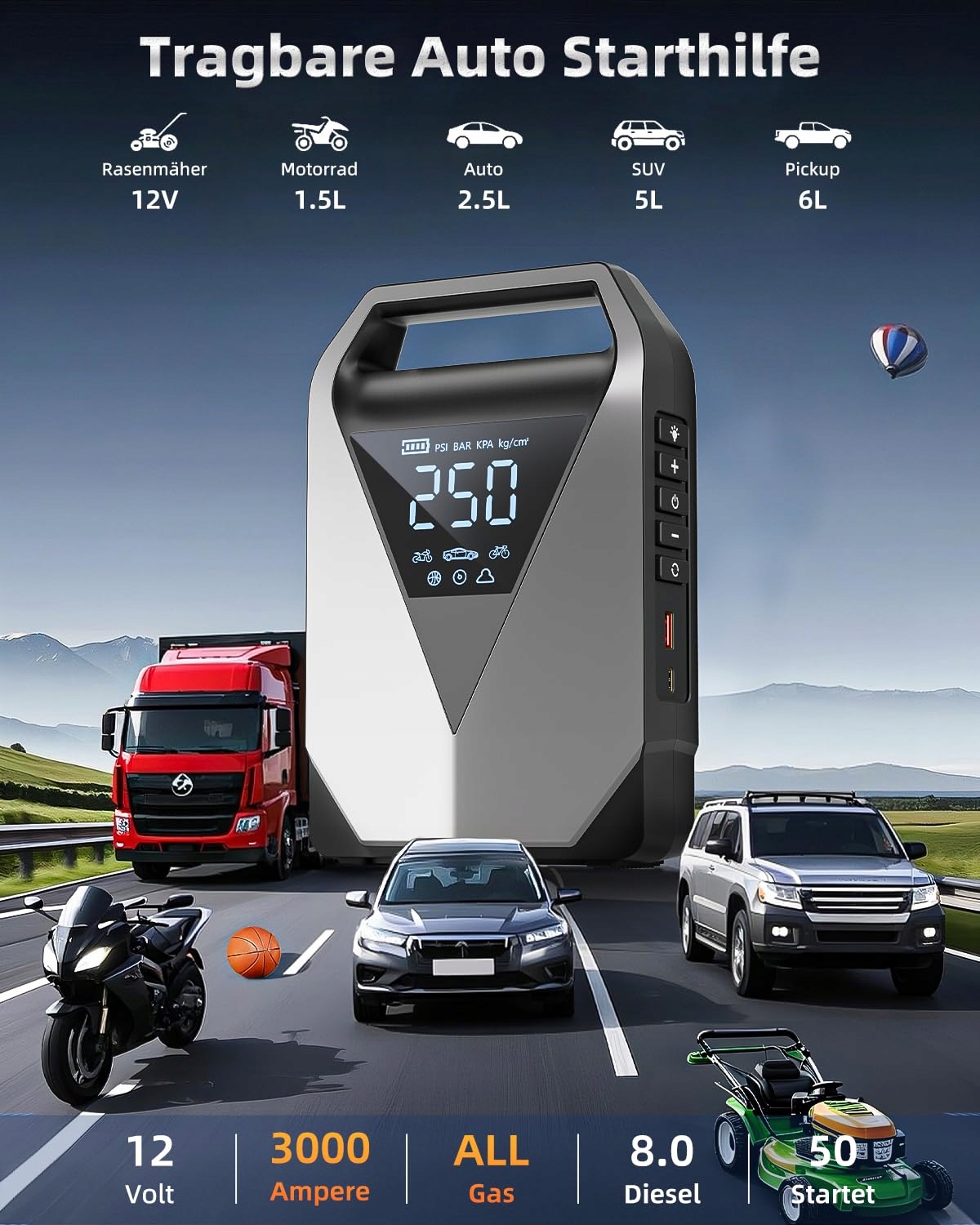 🌟[6W1 URZĄDZENIE WIELOFUNKCYJNE]Nasze szybkie źródło zasilania posiada sześć podstawowych funkcji: rozruch akumulatora samochodowego, pompka do opon samochodowych, mobilne źródło zasilania, miernik ciśnienia, funkcja szybkiego ładowania oraz 3 tryby światła kempingowego. Czyni to z niego przenośny, wszechstronny i niezbędny zestaw outdoorowy na wyjazdy.