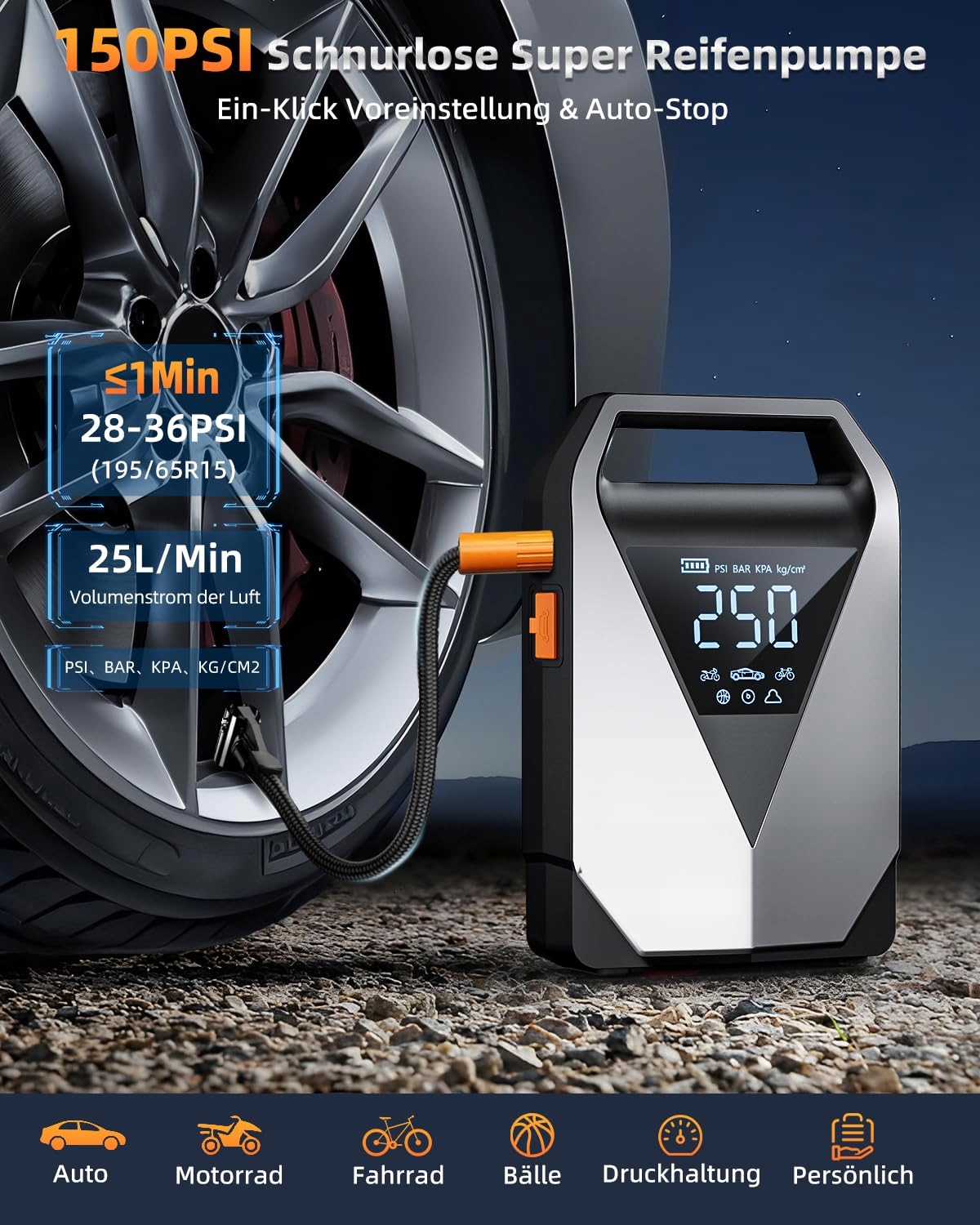 🚗[6 TRYBÓW KOMPRESORA POWIETRZA]Kompresor powietrza 150PSI z inteligentnym cyfrowym wyświetlaczem i funkcją wykrywania ciśnienia w oponach może pompować w 6 trybach: piłka, rower, motocykl, samochód, ciśnienie podtrzymujące i tryb swobodnej inflacji. Z przełączaniem 4 jednostek ciśnienia (BAR, PSI, KPA, Kg/c㎡), może napompować Twoje opony od 0 do 36PSI w ciągu kilku minut i automatycznie zatrzymuje pompowanie po osiągnięciu ustawionej wartości.