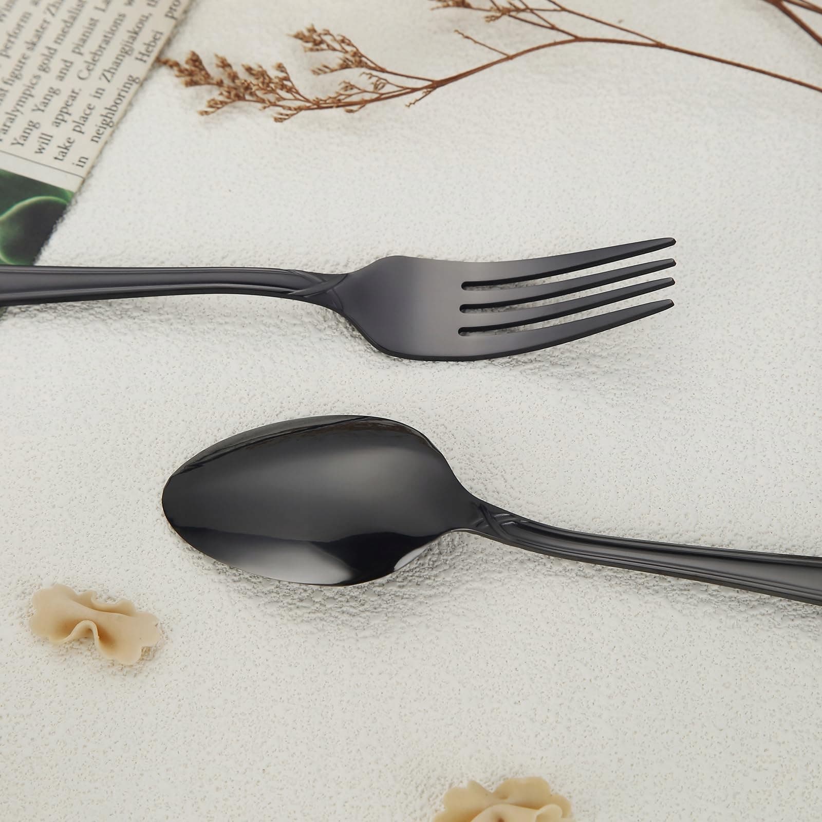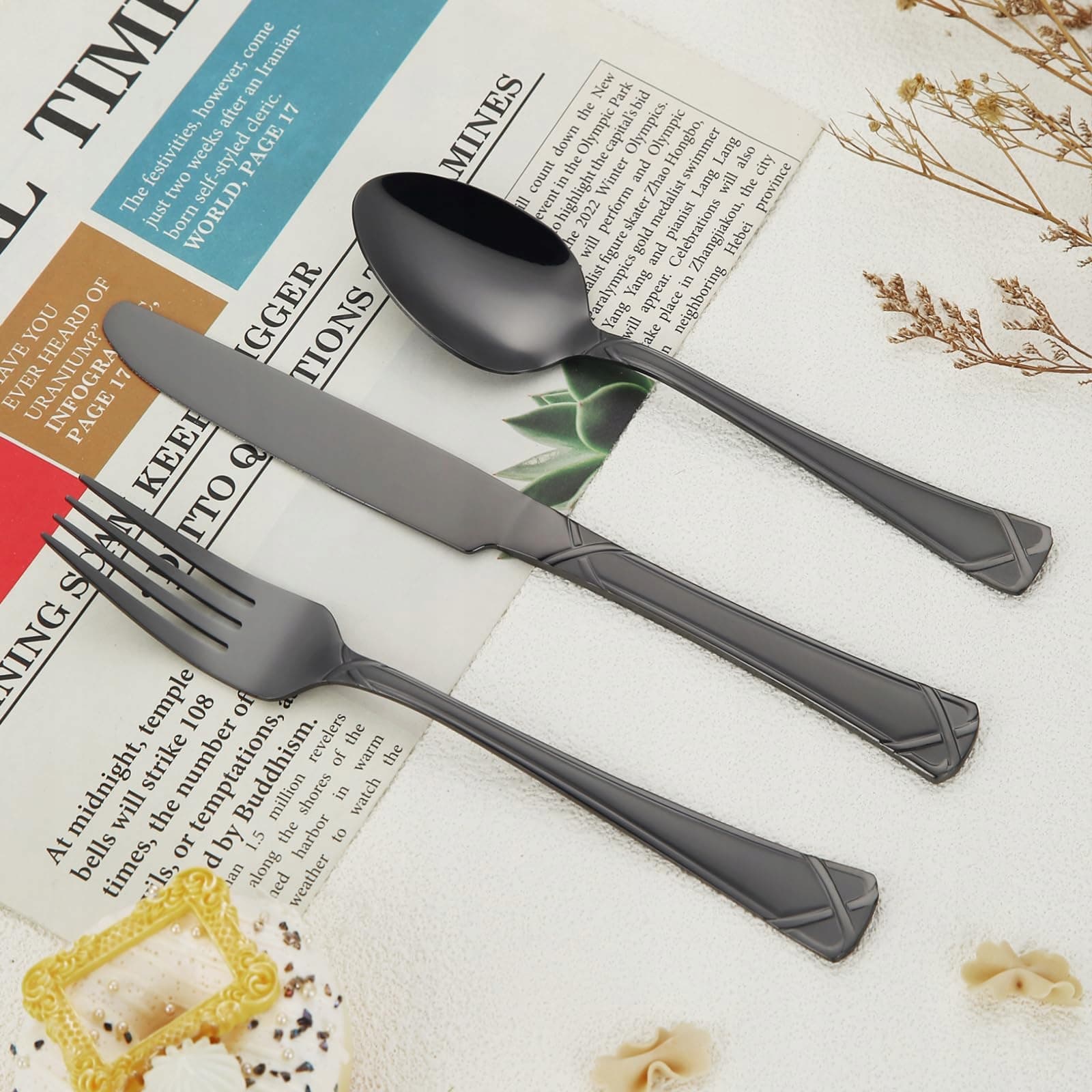 ELEGANCKI DESIGN: Z efektowną czarną powierzchnią, ten zestaw sztućców emanuje luksusowym, wysokopołyskowym blaskiem, podczas gdy uchwyty mają matową powierzchnię, która sprawia, że każde nakrycie stołu wygląda królewsko i elegancko. Idealny na codzienne posiłki i specjalne okazje.