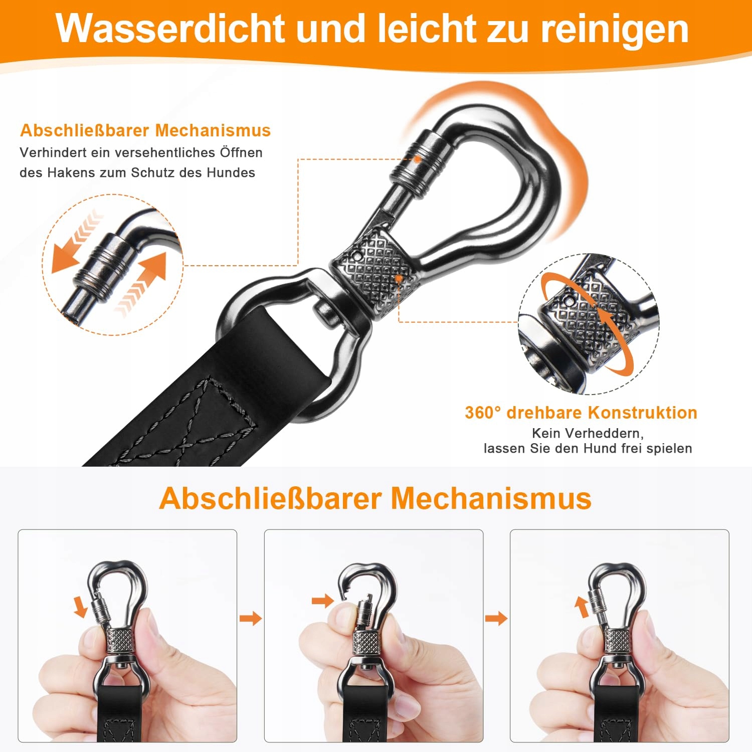 [Ulepszony zamykany karabińczyk]Nasz piękny metalowy karabińczyk w kształcie kości jest chwalony przez właścicieli zwierząt na całym świecie. Wynika to z faktu, że wytrzymuje on siłę ciągnącą do 200 KG i posiada dodatkowy mechanizm zamykający. Zamykane wzornictwo zapobiega przypadkowemu otwarciu karabińczyka przez psa i jego ucieczce z pola widzenia. Karabińczyk można obracać o 360°, co pozwala psu swobodnie węszyć.