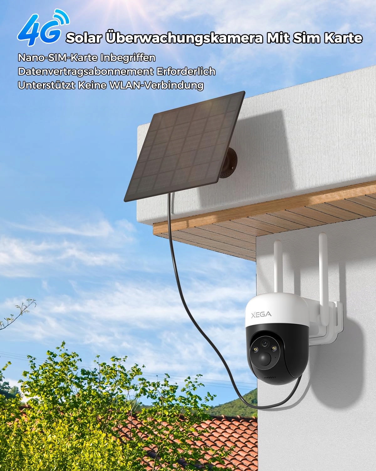 Xega 4G LTE Kamera monitoringu Solarna bateria z kartą SIM, 2K 3MP Bezprzewodowa zewnętrzna kamera PTZ IP Outdoor bez Wi-Fi, kolorowy tryb nocny 355°/90° obracana, wykrywanie PIR, kolorowy tryb nocny, dwukierunkowe audio, IP66