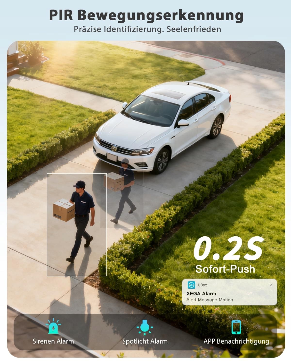 【DWA INTELIGENTNE TRYBY WYKRYWANIA】Kamera solarna LTE oferuje dwa inteligentne tryby wykrywania: wykrywanie osób identyfikuje wyłącznie aktywność ludzką. Wykrywanie w określonych obszarach koncentruje się na obszarach wysokiego ryzyka, takich jak bramy czy magazyny. Po wykryciu zagrożenia zewnętrzna kamera z kartą SIM włącza światło ostrzegawcze i automatycznie zapisuje nagrania wideo na karcie TF (brak w zestawie) lub w chmurze (1,99 €/miesiąc, opcjonalnie).
