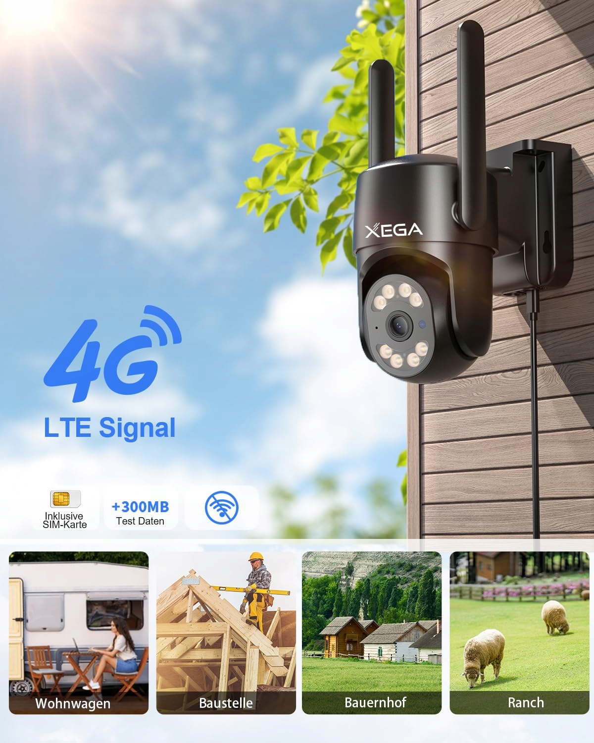 【4G KOMÓRKOWA Z KARTĄ SIM I BEZ WSPARCIA WIFI】-- XEGA 4G kamera monitoringu zewnętrznego działa w obszarach z zasięgiem 4G LTE, co czyni ją idealną do miejsc bez dostępu do Wi-Fi, takich jak garaże, farmy, magazyny, rancza itp. Włożona karta SIM zawiera 300 MB danych do testów (w ciągu 30 dni). Nielimitowany pakiet danych 4G: 12,9 €/30 dni lub pakiet danych od EE, SKY, Vodafone, Orange. Proszę pamiętać, że 4G kamera monitoringu zewnętrznego jest przewodowa i nie ma baterii oraz nie obsługuje łączności Wi-Fi.