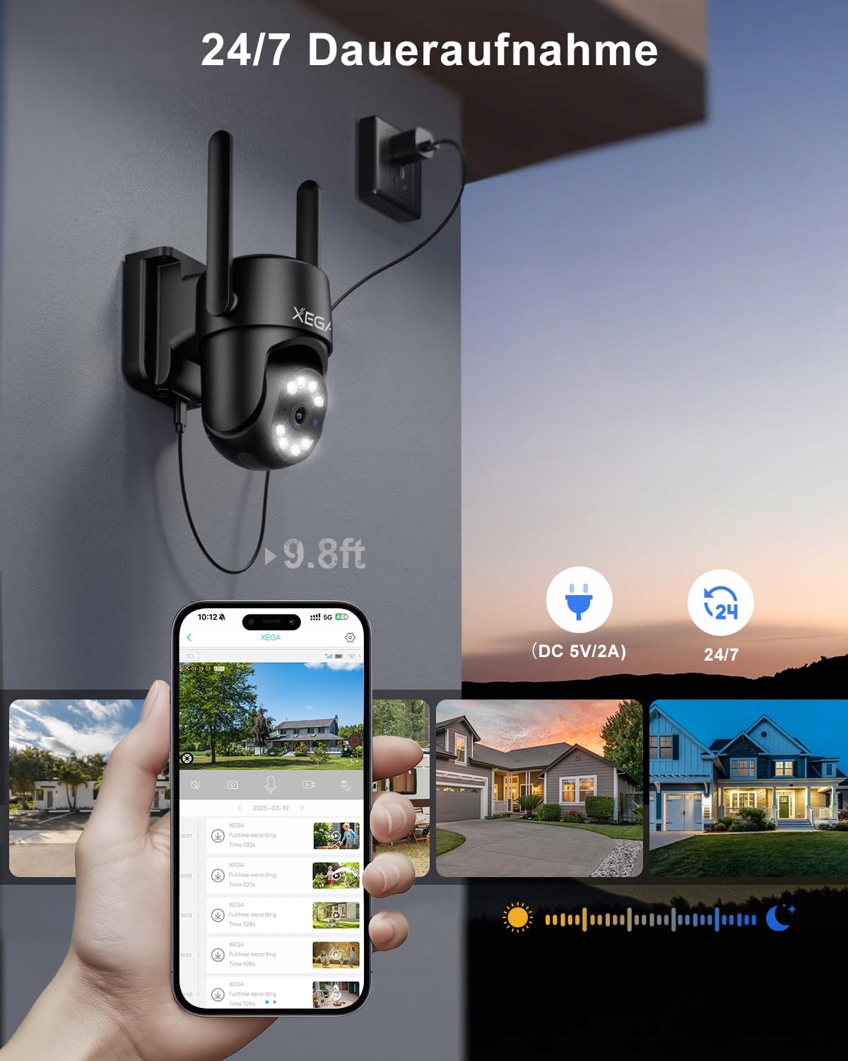 Xega 4G LTE Kamera monitoringu zewnętrznego【24/7 Nagrywanie】 2K CCTV PTZ Kamera przewodowa bez Wi-Fi, Automatyczne śledzenie AI wykrywanie ludzi Alarm IP66 TF/Cloud Storage, z kartą SIM