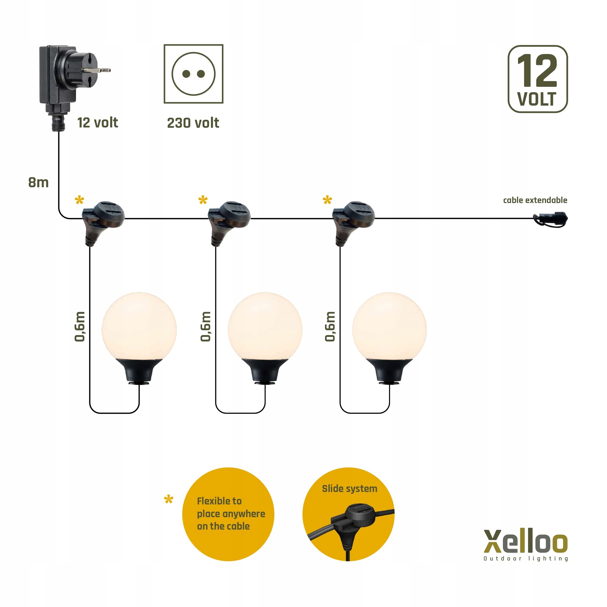 PRAKTYCZNY I BEZPIECZNY TRANSFORMATOR 12 V Wszystkie produkty Xelloo mają transformator niskonapięciowy 12 V do bezpiecznej instalacji bez wiedzy elektrotechnicznej. Po podłączeniu opraw za pomocą praktycznego systemu przesuwnego Xelloo do 8-metrowego kabla zasilającego, podłącz kabel zasilający do transformatora. Następnie podłącz wtyczkę transformatora do gniazdka i gotowe.