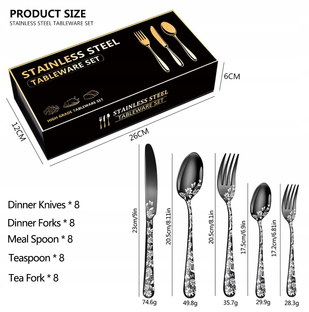【Serwis dla 8 osób】 Ten matowoczarny zestaw sztućców zawiera 8 noży stołowych, 8 widelców stołowych, 8 łyżek stołowych, 8 łyżeczek do herbaty oraz 8 widelczyków do herbaty. Piękne podstawy dla rodziny 8-osobowej lub jako zapas na przyjęcia czy kolacje w ciągu tygodnia.