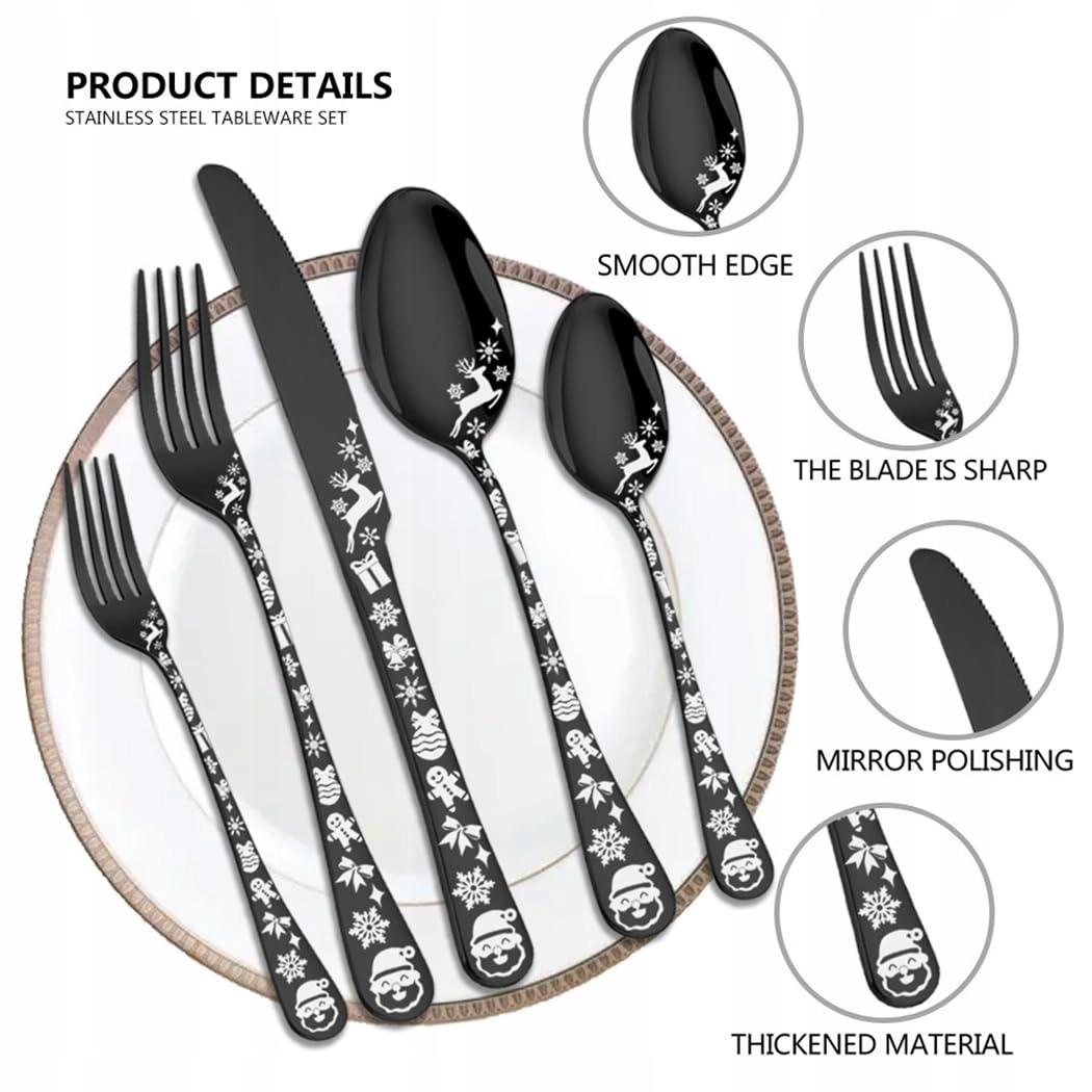 XIAOYU 20-częściowy zestaw sztućców świątecznych, czarny zestaw sztućców dla 4 osób, sztućce ze stali nierdzewnej, unikalny wzór płatków śniegu, Mikołaja i renifera, nadaje się do mycia w zmywarce, złoty