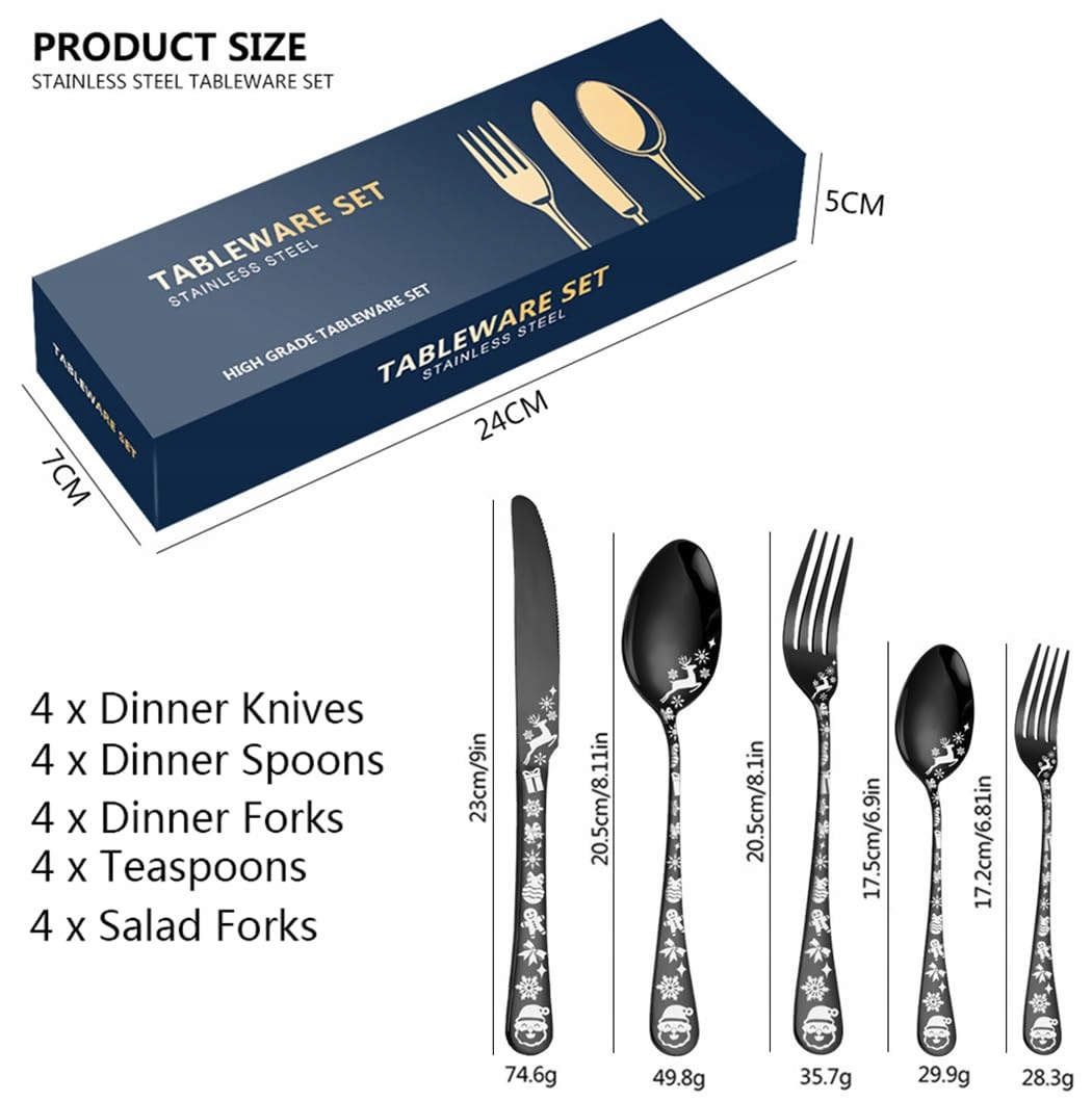 【Zestaw sztućców dla 4 osób】20-częściowy zestaw sztućców świątecznych zawiera po 4 sztuki: 4 noże do obiadu, 4 łyżki do obiadu, 4 widelce do obiadu, 4 łyżeczki, 4 widelczyki do sałatek, idealny prezent na Boże Narodzenie, Święto Dziękczynienia i parapetówkę.