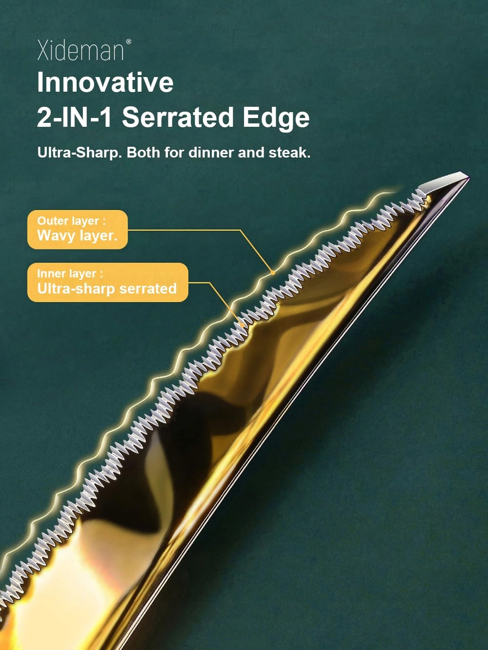 Zestaw sztućców Xideman® dla 6 osób, młotkowane złoto, z ultraszpiczastym nożem 2-w-1 ząbkowanym, złoty zestaw sztućców ze stali nierdzewnej 18/10, 24 części, zestaw noży, widelców i łyżek, nadaje się do mycia w zmywarce