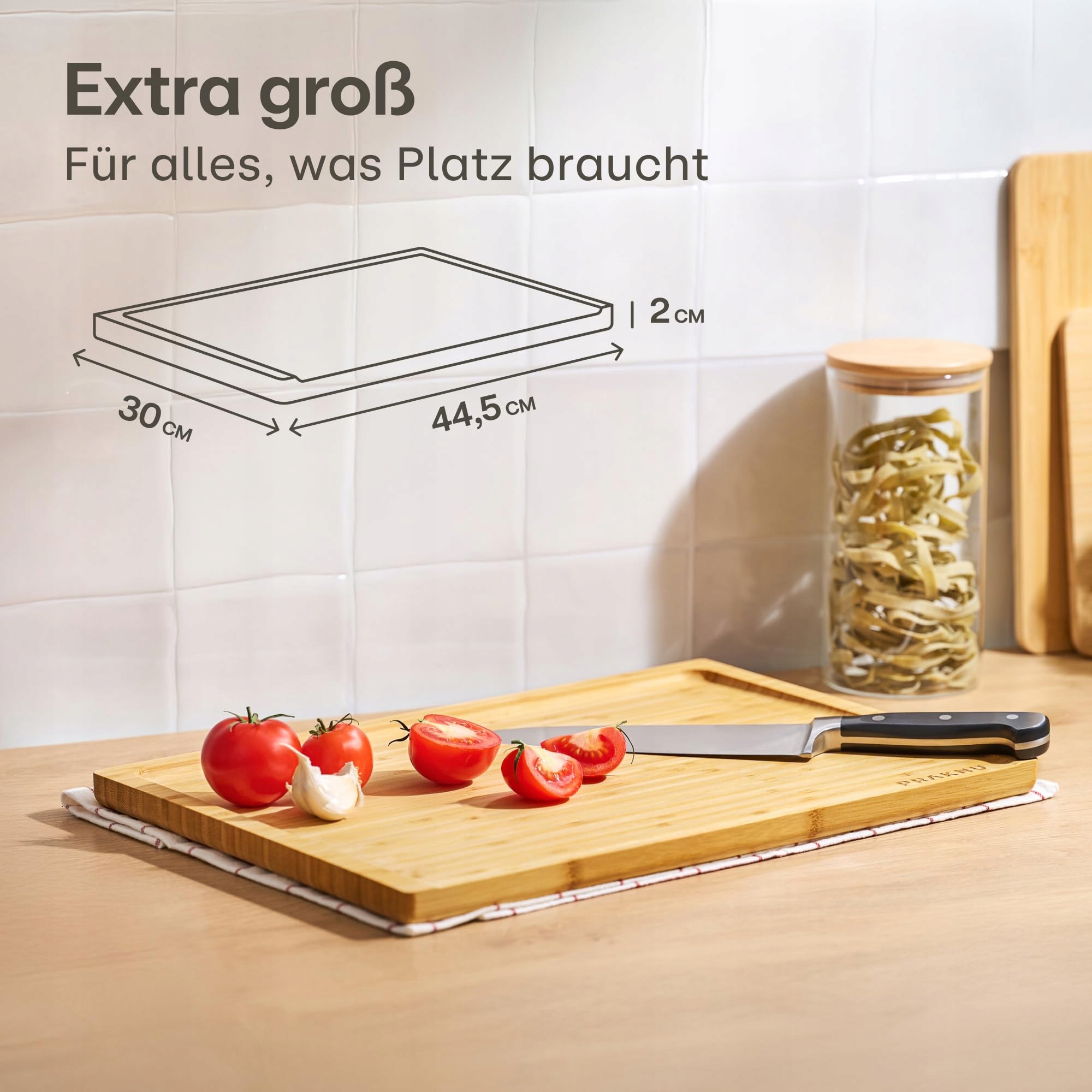 Extra duża i stabilna: Z wymiarami 44,5 x 30 cm idealna do dużych prac krojenia. Konstrukcja o grubości 2 cm zapewnia trwałą stabilność.