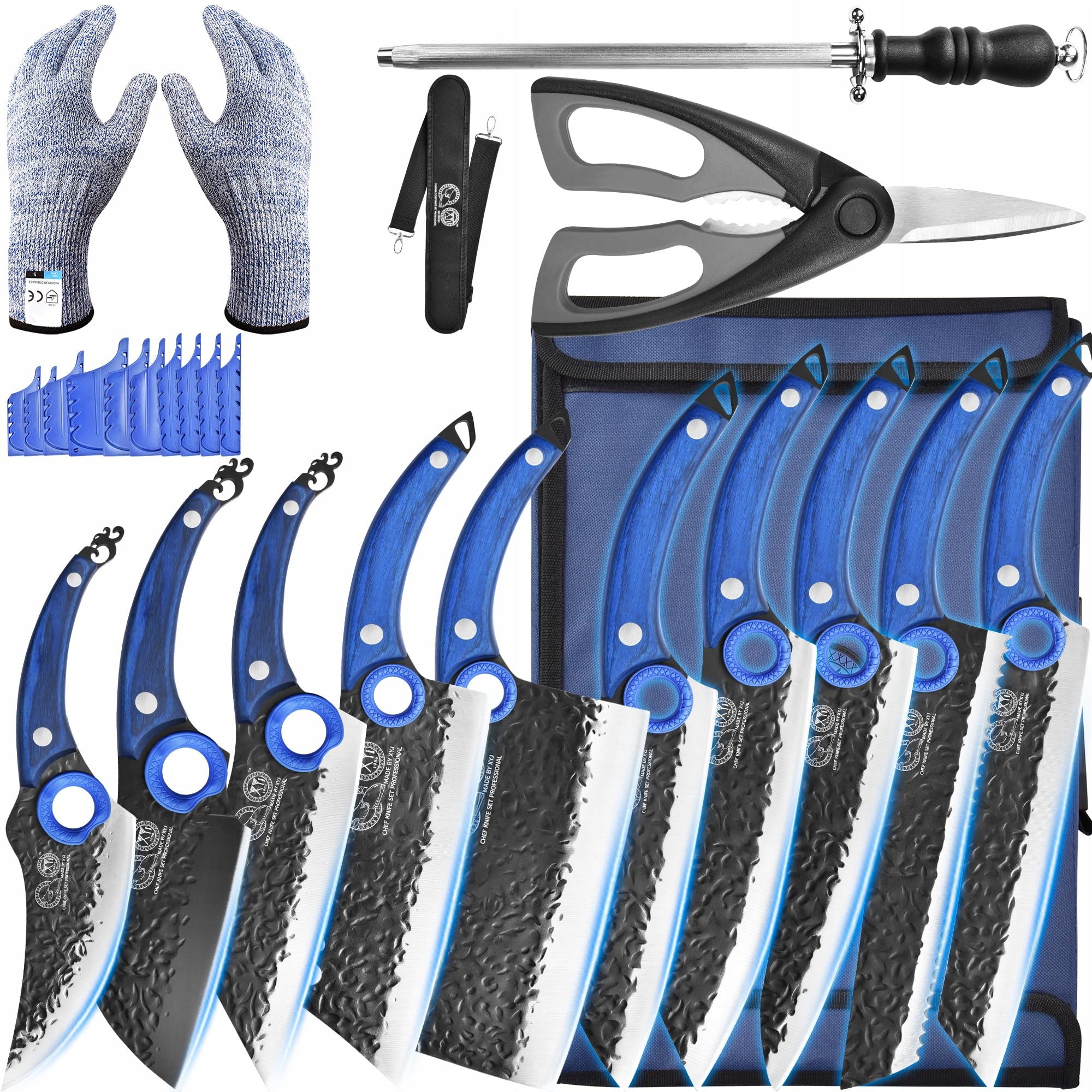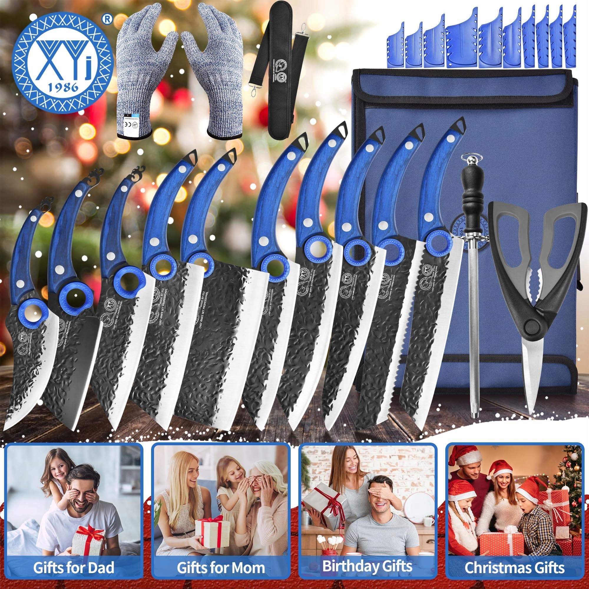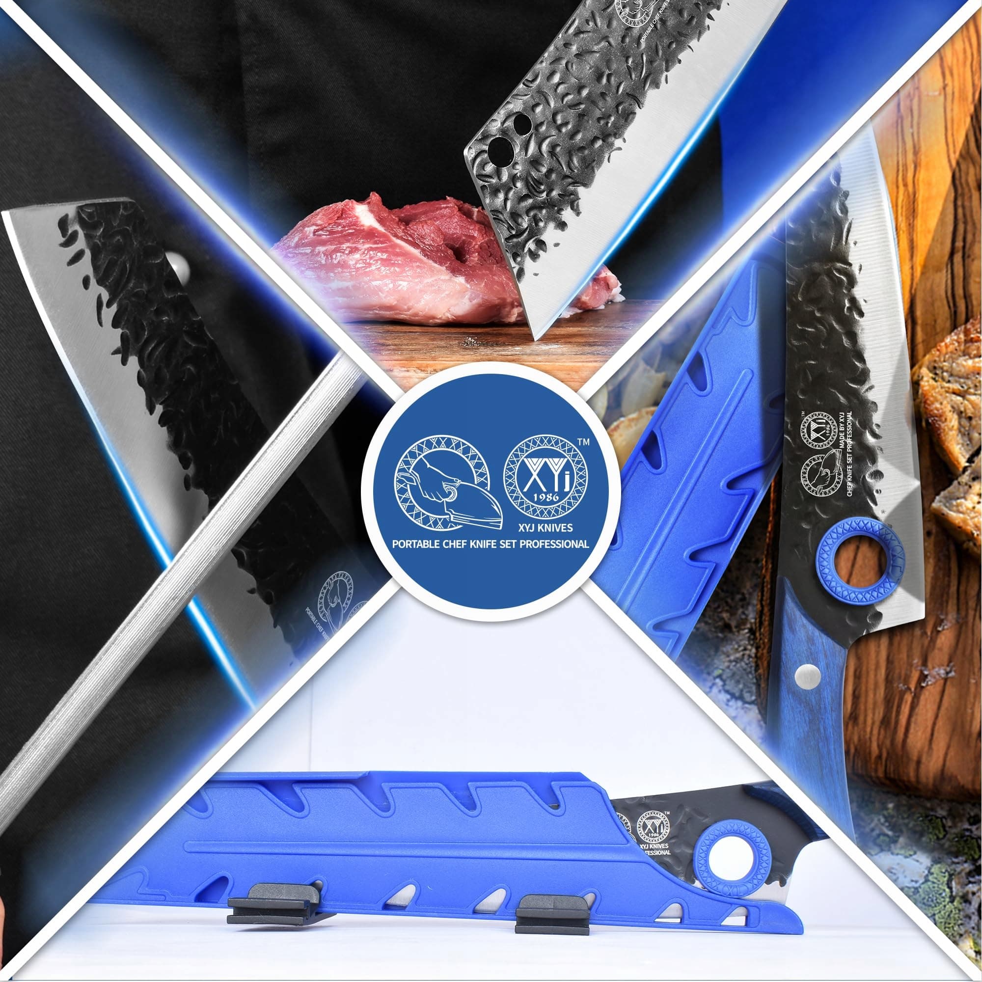 XYJ Autentyczne od 1986, 10-częściowy zestaw noży kuchennych z niebieską torbą, nożyczki, stal honująca, kamień do ostrzenia, duży zestaw noży rzeźniczych, noże kuty, pełny uchwyt, stal węglowa