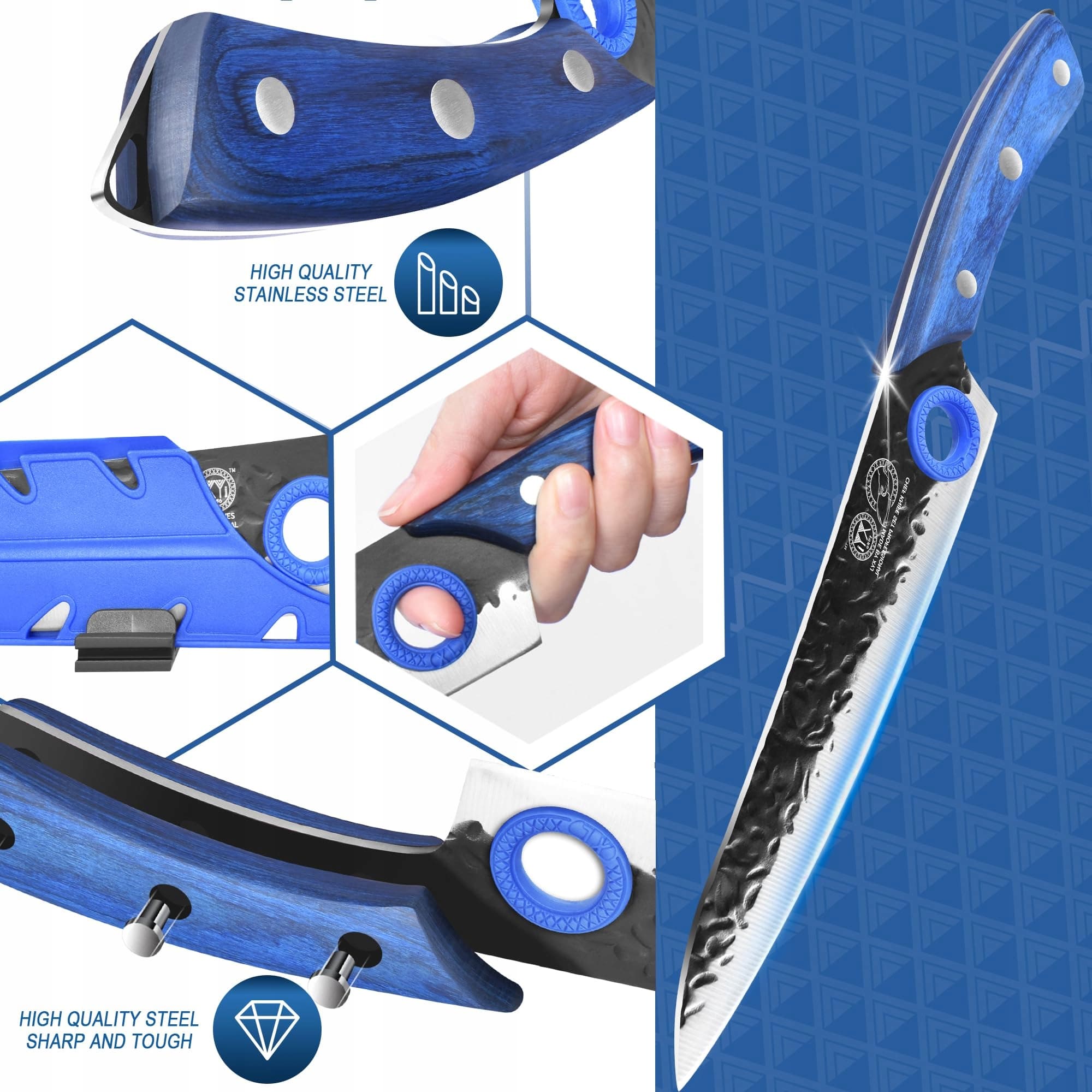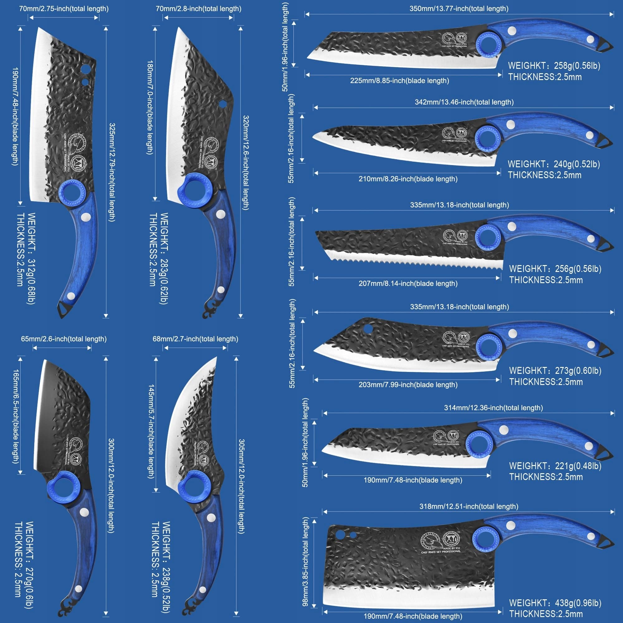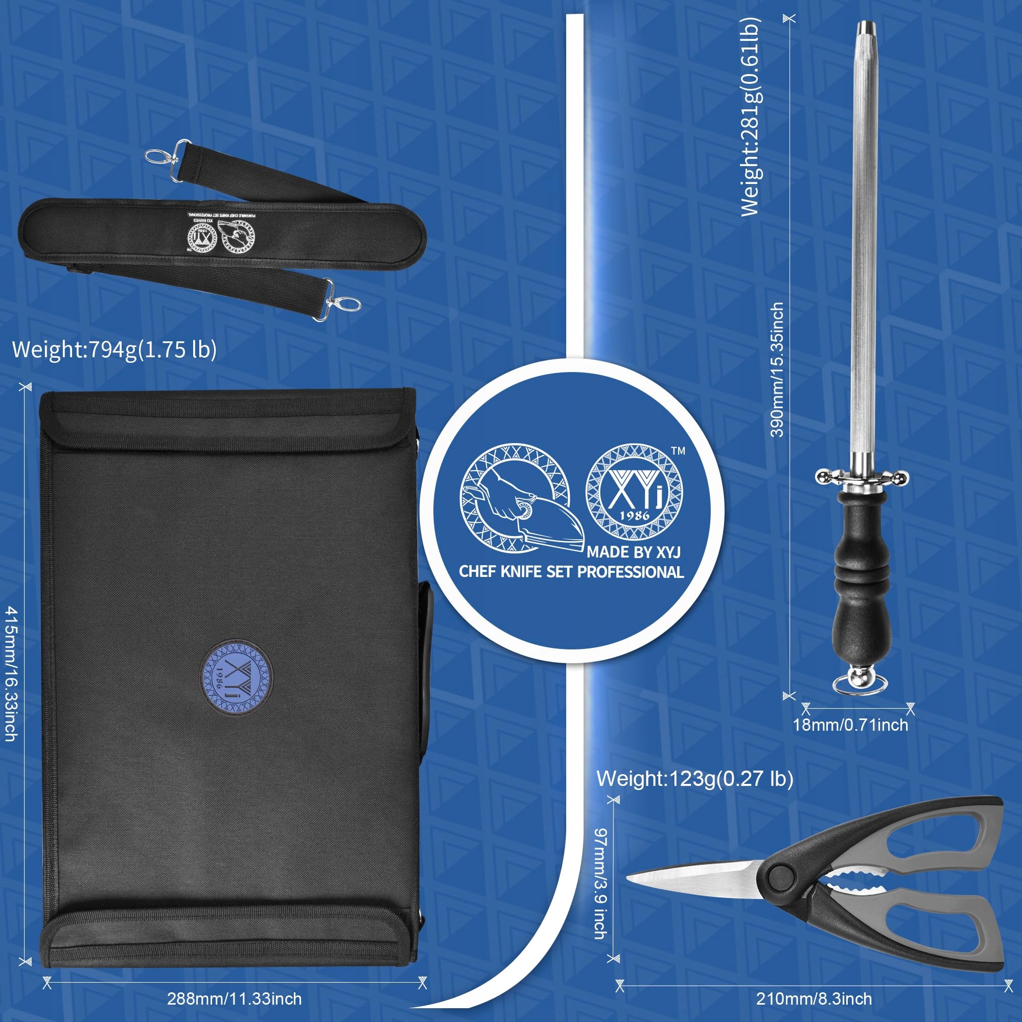 XYJ Autentyczne od 1986, 10-częściowy zestaw noży kuchennych z niebieską torbą, nożyczki, stal honująca, kamień do ostrzenia, duży zestaw noży rzeźniczych, noże kuty, pełny uchwyt, stal węglowa
