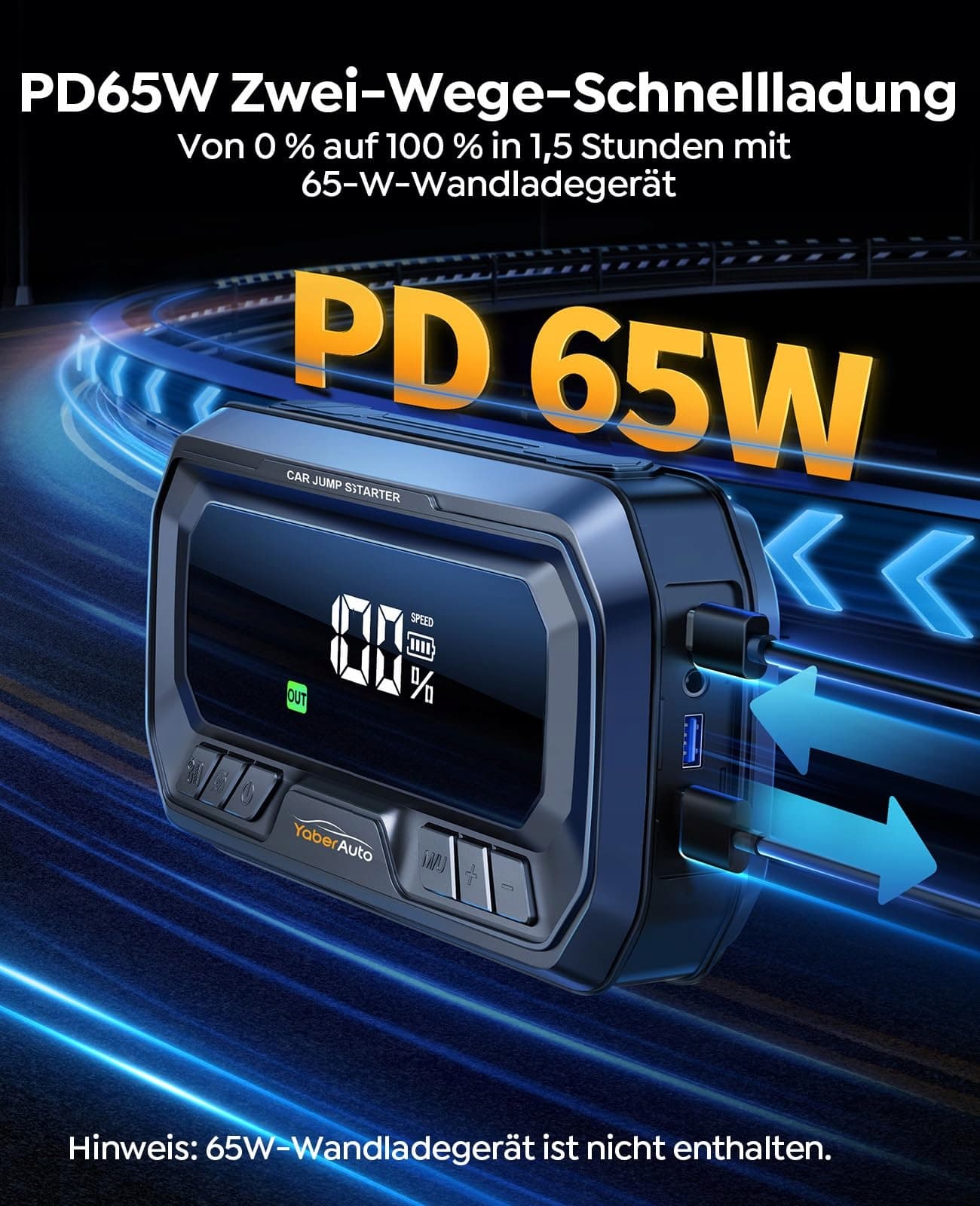 PD 65W szybkie ładowanie: Dzięki tej kompaktowej i wszechstronnej Powerbank rozruchowej do samochodu możesz szybciej i efektywniej ładować swoje urządzenia elektroniczne. Dzięki dodatkowym wyjściom DC, portom USB-A i USB-C możesz ładować wiele urządzeń jednocześnie.