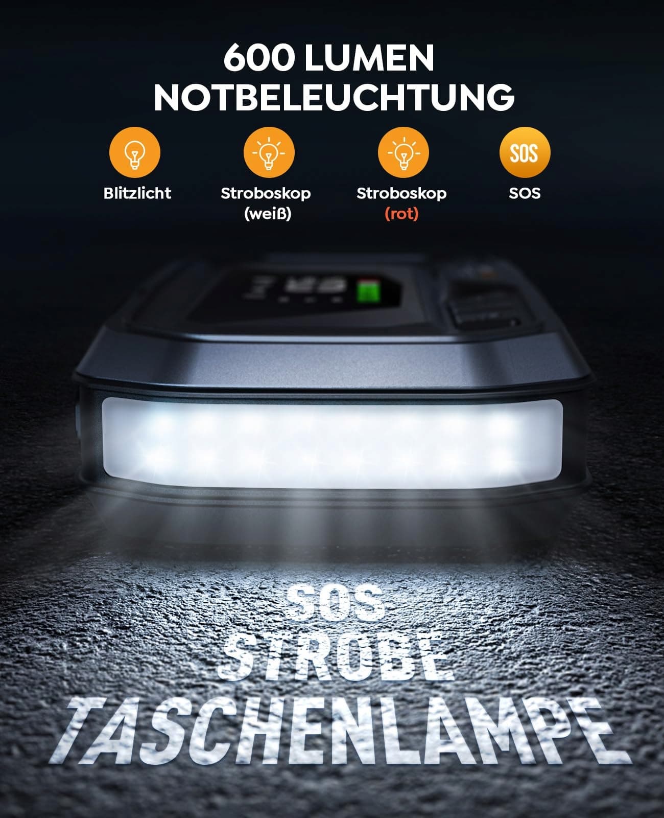 600 lumenów oświetlenia awaryjnego: Powerbank do rozruchu dla samochodów osobowych jest wyposażona w światło LED z 4 trybami: oświetlenie, stroboskop (biały), stroboskop (czerwony) i SOS. Niezależnie od tego, czy potrzebujesz latarki, czy sygnału awaryjnego, to światło ma Cię pokryte.