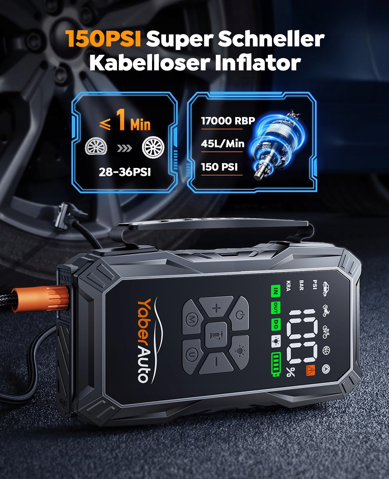 YABERAUTO Powerbank Z Rozruchem Kompresor 150PSI 6000A 23800mAh LCD 500lm